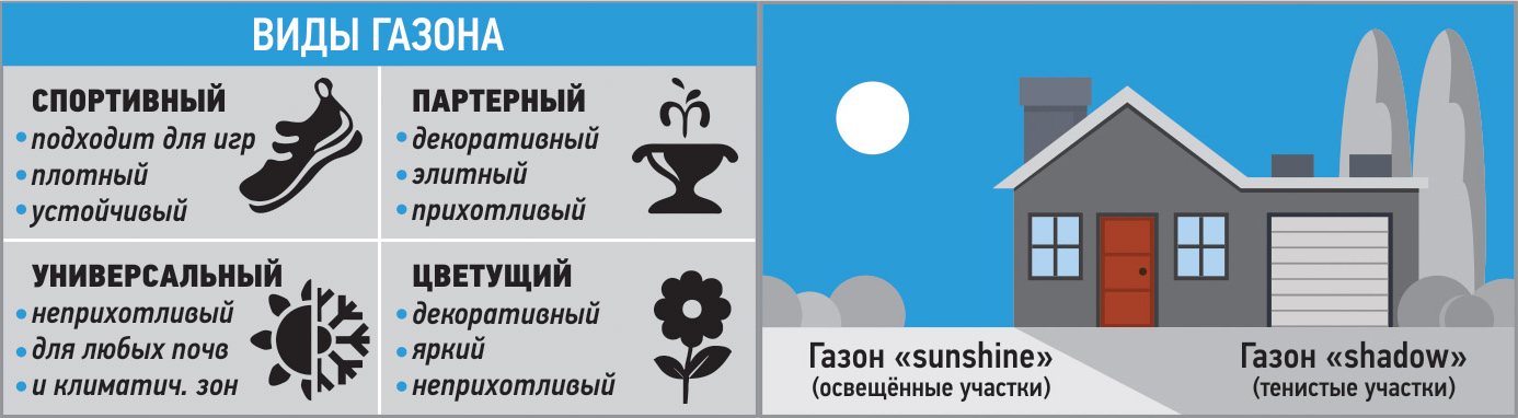 При выборе газона необходимо оценить освещенность участка. Если у вас хорошо освещенный участок, то вам подойдет газон типа «sunshine», в противном случае лучше отдать предпочтение газону «shadow».