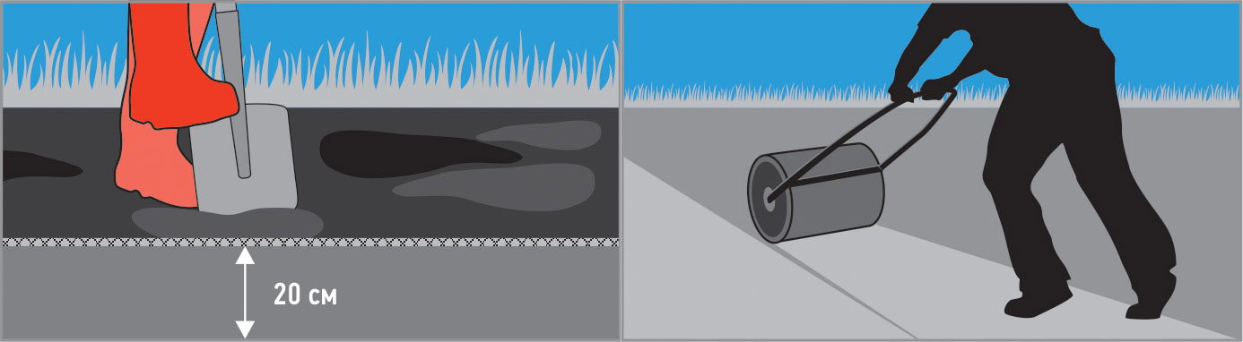 - утрамбуйте землю с помощью бревна, доски или ручного катка. Утрамбовывать землю нужно до тех пор, пока грунт не перестанет проминаться