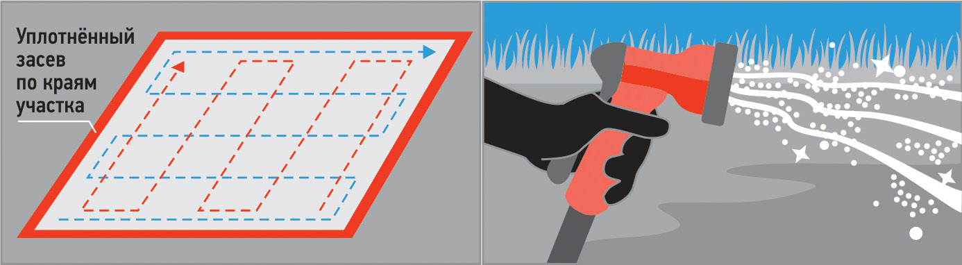 - руками или с помощью ручной механической сеялки засеивайте участок сначала вдоль, потом поперек. На края газона нужно в два раза больше семян