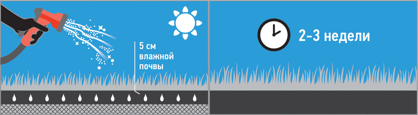- срок появления первых всходов зависит от выбранного вами газона, это может быть 2-3 недели
