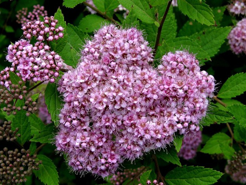 Мелкие цветы розово-красные, размером в 0,5 см. Собраны в щиткообразные соцветия диаметром 2–3 см на концах веток. Цветение начинается в июне, продолжительность около 45 дней. Обрезка подсохших соцветий продлевает сроки, кустарник способен цвести все лето, включая август.