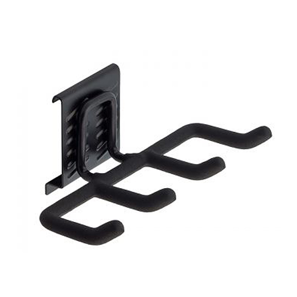 Конструкция крепления крюка обеспечивает надёжную фиксацию. Легко устанавливается и снимается одним движением. Крюк крепится на специальный рельс. Изготовлен из стали с резиновым покрытием чёрного цвета.