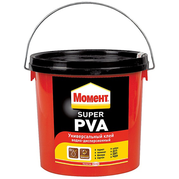 Быстросхватывающий, термостойкий, высокопрочный клей для всех пород дерева, ДСП, ДВМ, МТФ, фанеры, шпона, ламината, картона, фурнитуры, ткани, кожи, некоторых пластиков. Момент Super PVA рекомендуется для монтажного склеивания ламинированных и паркетных напольных покрытий. Прозрачный после высыхания.