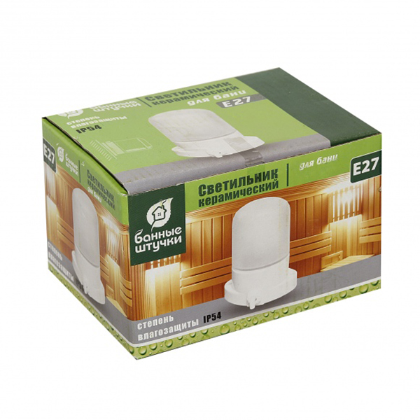 Светильник для бани «Банные штучки» предназначен для освещения бань и саун. Светильник имеет высокую степень защиты электроклемм и стекла лампы от разрушающего действия внешней среды. Имеет керамический корпус, матовый плафон из термостойкого стекла, силиконовую прокладку. Выдерживает температуру до 125 градусов. Легко и безопасно монтируется в помещении бани и сауны.