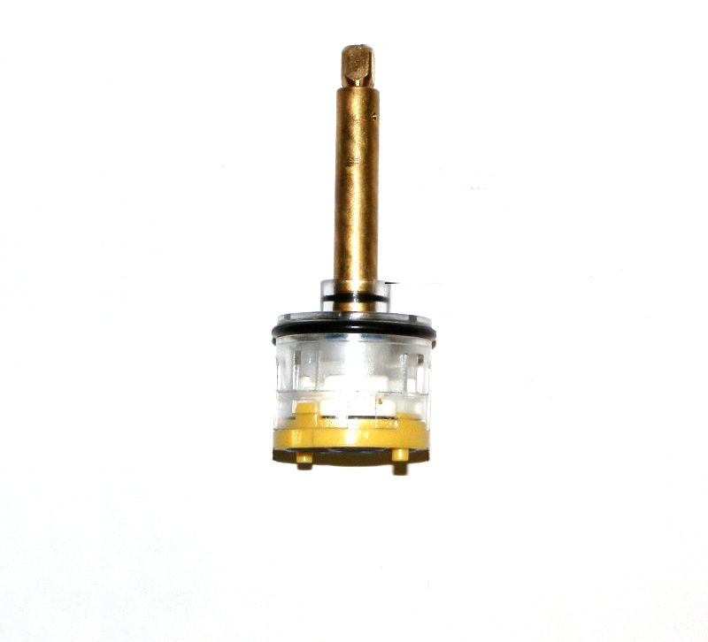Картридж представляет собой сборный цилиндр из пластмассы с керамическими пластинами внутри, с отверстиями снизу и штоком сверху, на который надевается рукоятка. Картридж – это важное звено в подаче воды. Горячая и холодная вода попадает из своих магистралей в картридж, и только там происходит их смешивание. Благодаря этому можно настроить необходимую температуру воды.