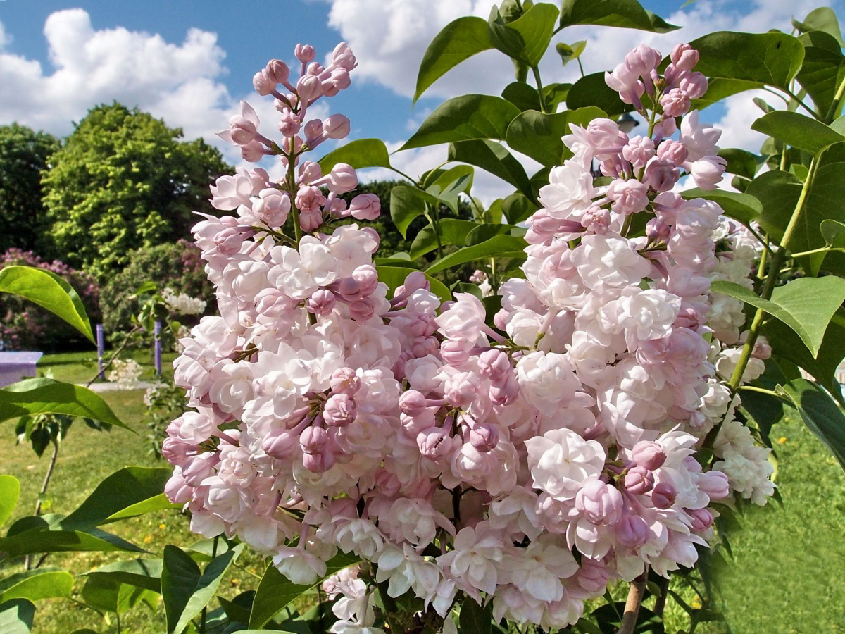 Красавица Москвы - эта сирень - настоящее произведение искусства. Бутоны крупные, шаровидные, розовато-лиловые с атласным блеском. Цветки симметричные, совершенной формы, состоят из 2-3 венчиков, в полуроспуске похожи на прелестные розочки удивительно красивого цвета. Розовато-белые с перламутровым переливом, они постепенно становятся жемчужно-белыми с легким, едва проступающим румянцем. Соцветия крупные, вертикально расположенные. Кусты средней высоты, раскидистые, цветение ежегодное, обильное, продолжительное. Цветет в средние сроки. Сорт редкой красоты. Используют для срезки и в озеленении.