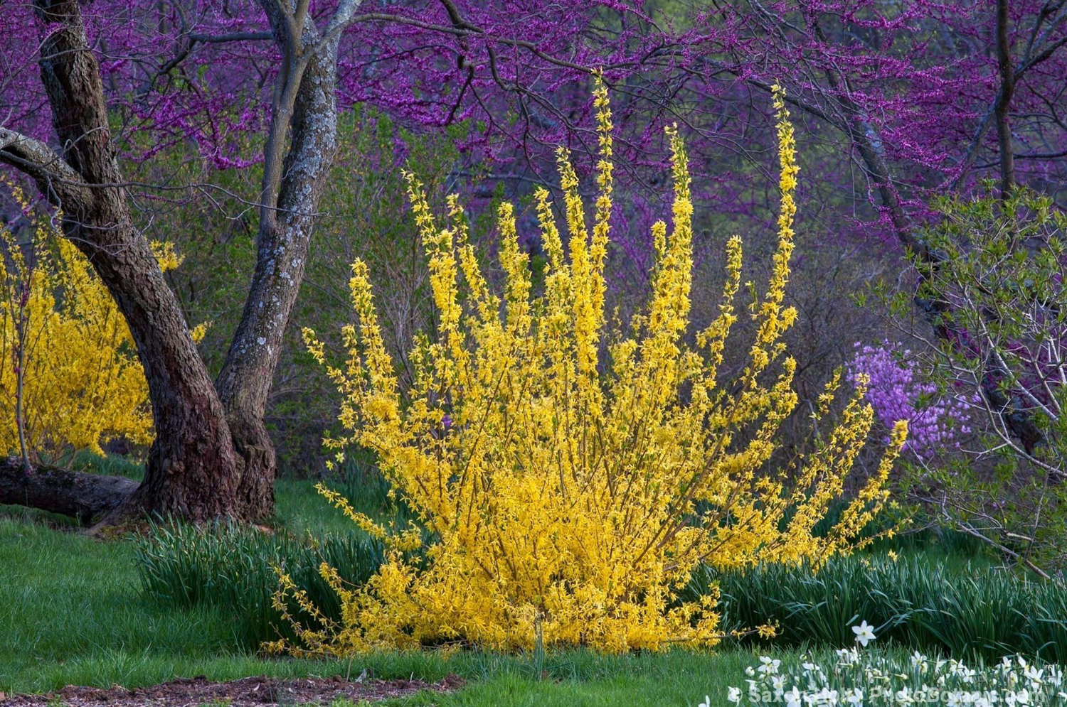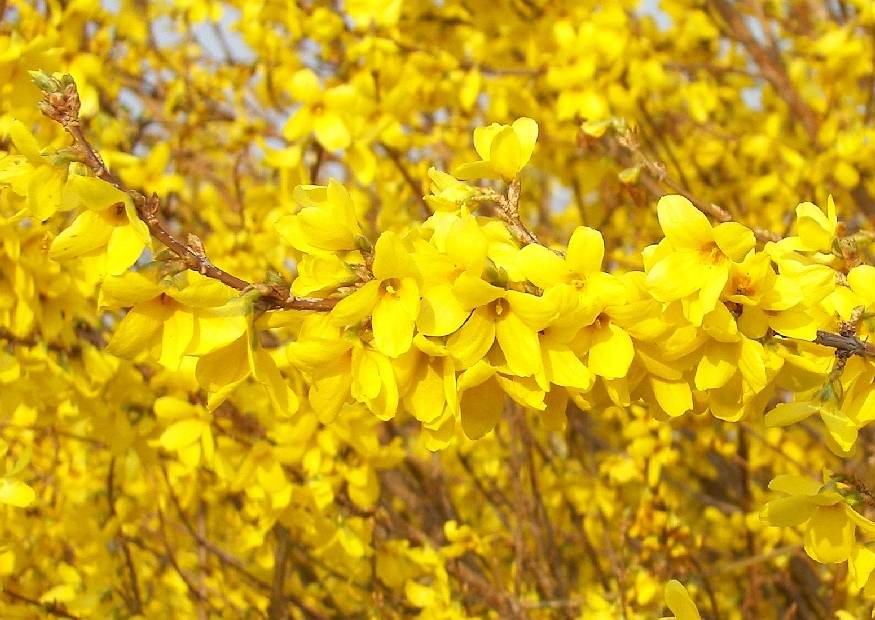 Форзиция - листопадный кустарник с супротивными листьями. Цветки желтые, распускаются весной до появления листьев, цветение обильное. Форзиция хорошо зимует и весной обильно цветет, если на зиму кусты пригибать к земле, чтобы ветви были укрыты снегом до наступления сильных морозов.