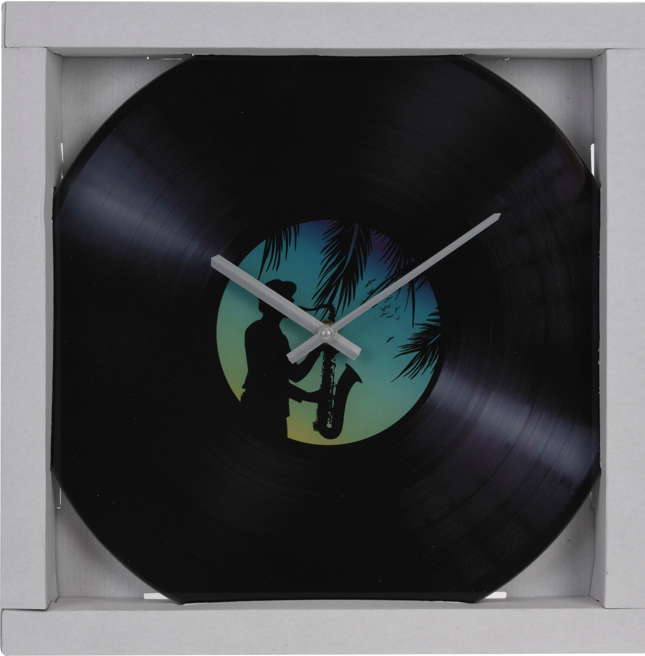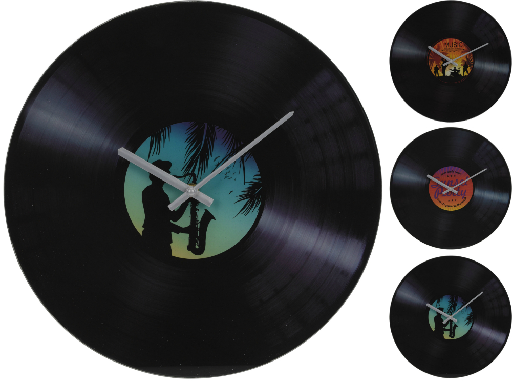 Эти настенные часы электромеханические, приводятся в действие электричеством. Имеют вид виниловой пластинки, находятся в стеклянном корпусе.