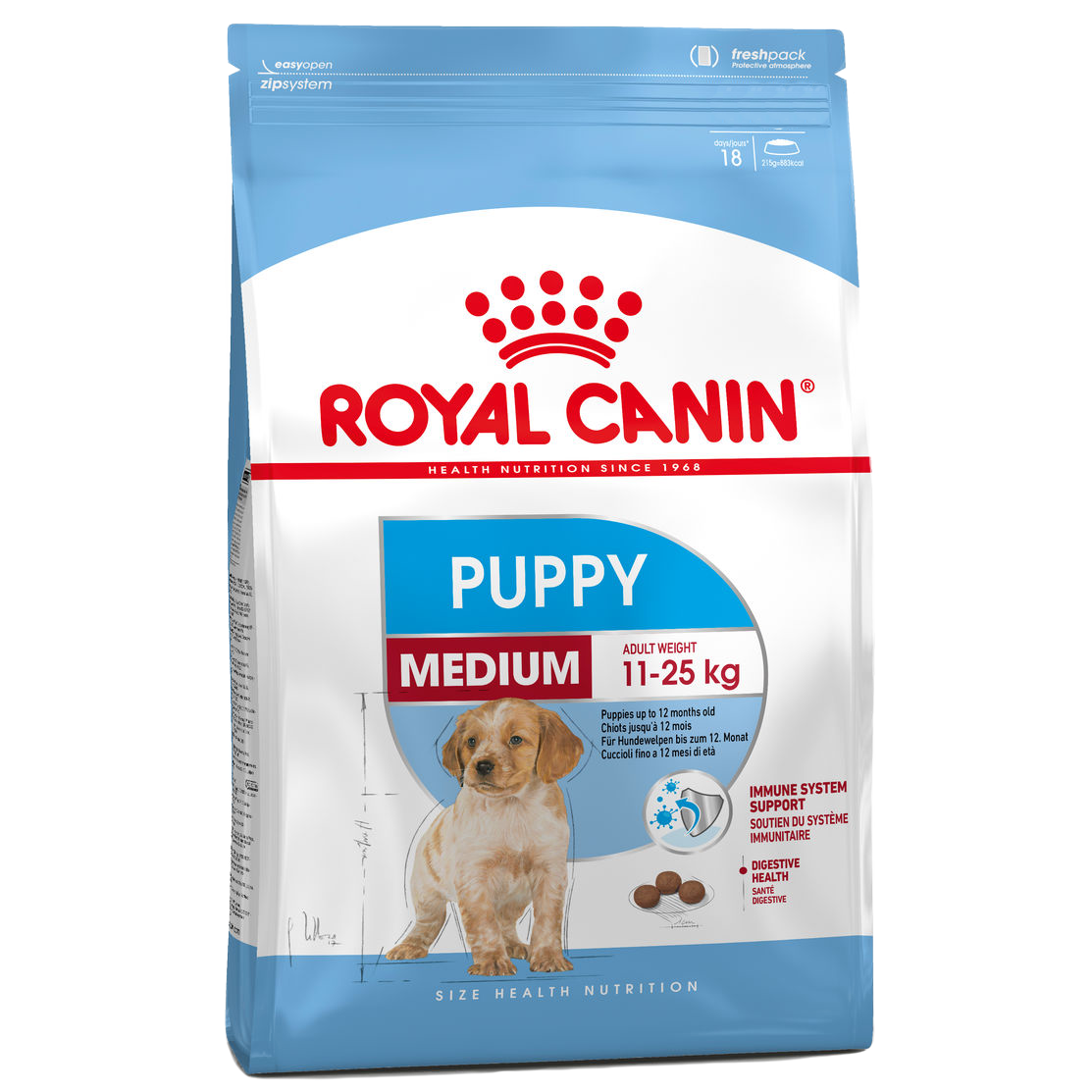 Полнорационный корм для щенков собак средних размеров (весом от 10 до 25 кг) в возрасте от 2 месяцев до 12 месяцев.