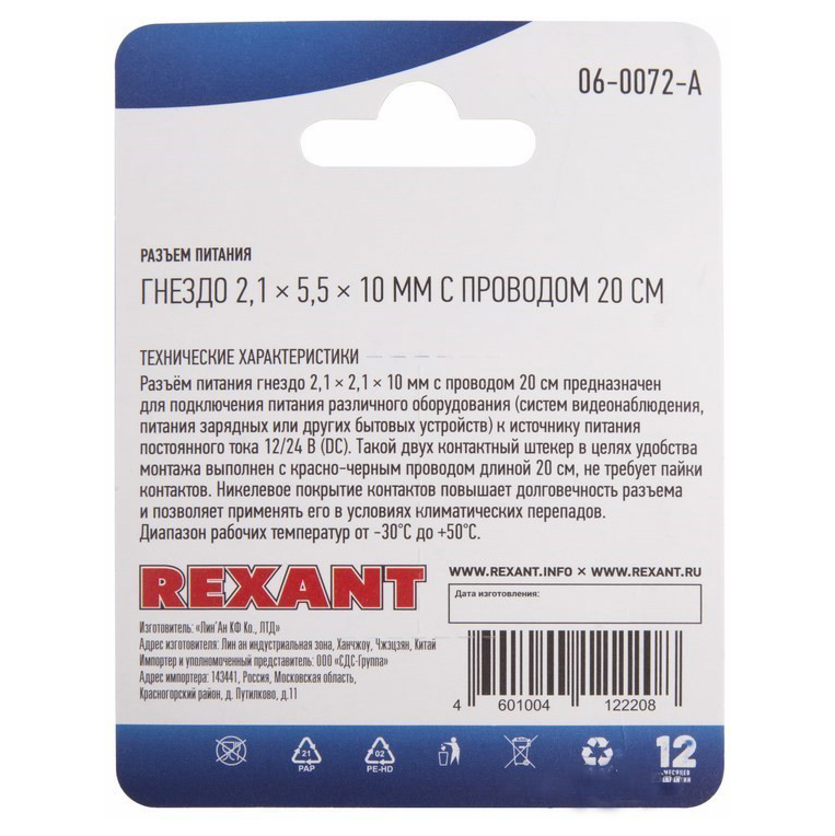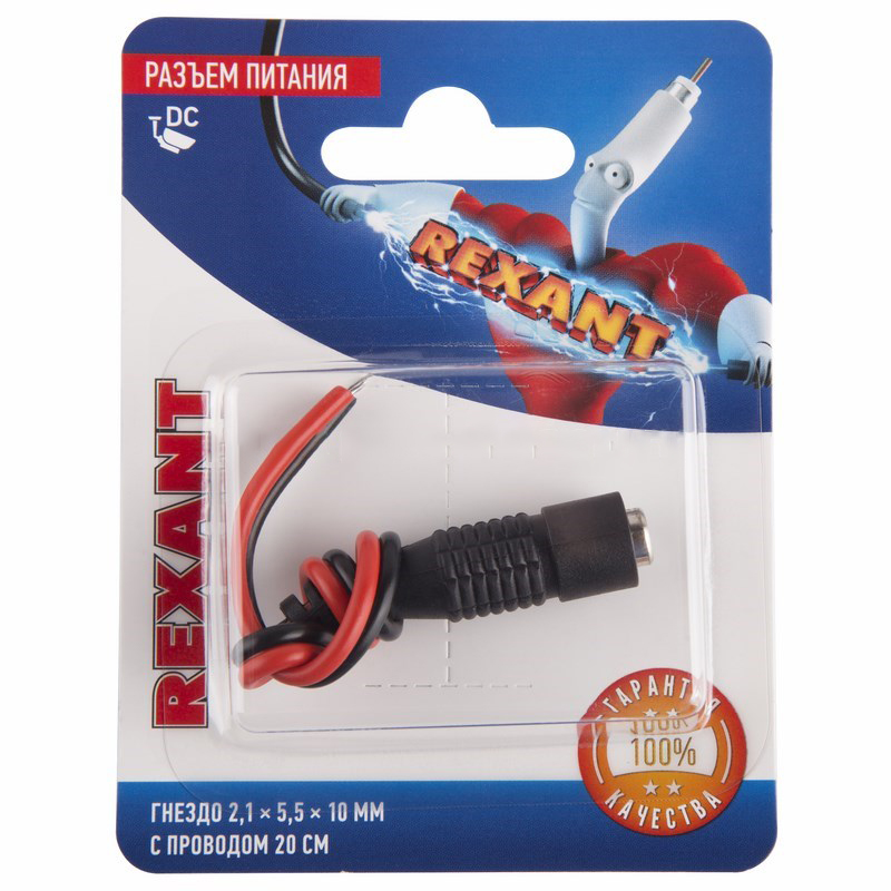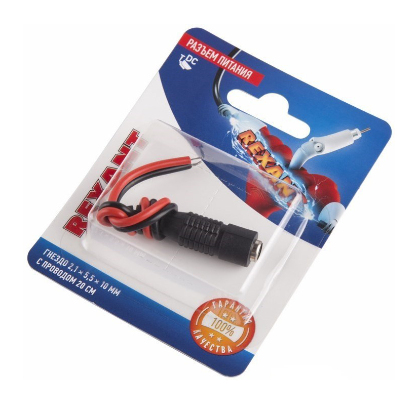 Разъем питания гнездо 2.1х5.5 с проводом 20см REXANT предназначен для подключения питания различного оборудования (систем видеонаблюдения, питания зарядных или других бытовых устройств) к источнику питания постоянного тока 12/24В (DC). Такое двухконтактное гнездо в целях ускорения и удобства монтажа выполнено с красно-черным проводом длиной 20 см, т.е. не требует пайки контактов. Окончания проводов подготовлены для дальнейшего монтажа: зачищены и облужены оловом. Никелевое покрытие контактов повышает долговечность разъема и позволяет применять его в условиях климатических перепадов. Гнездо питания имеет размеры 2.1х5.5x10мм. Диапазон рабочих температур от -30℃ до +50℃. Гнездо часто используется для замены вышедших из строя разъемов шнура и подходит к стандартным резервным источникам питания (DC).