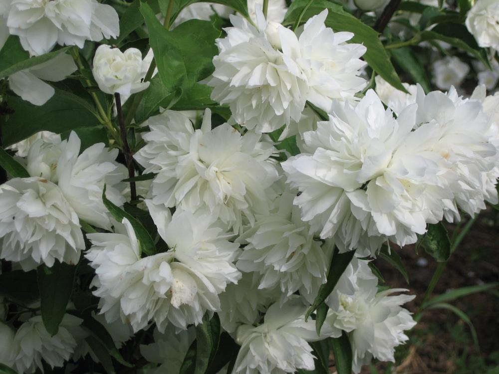 Жасмин садовый (Чубушник) - принадлежит к наиболее популярным садовым растениям. Он обильно цветет белыми или кремово-белыми душистыми цветками. Листья овальные светло-зеленые, цветки достигают в диаметре 2-4 см. Очень вынослив: может расти практически в любых условиях. Нуждается в ежегодной обрезке.