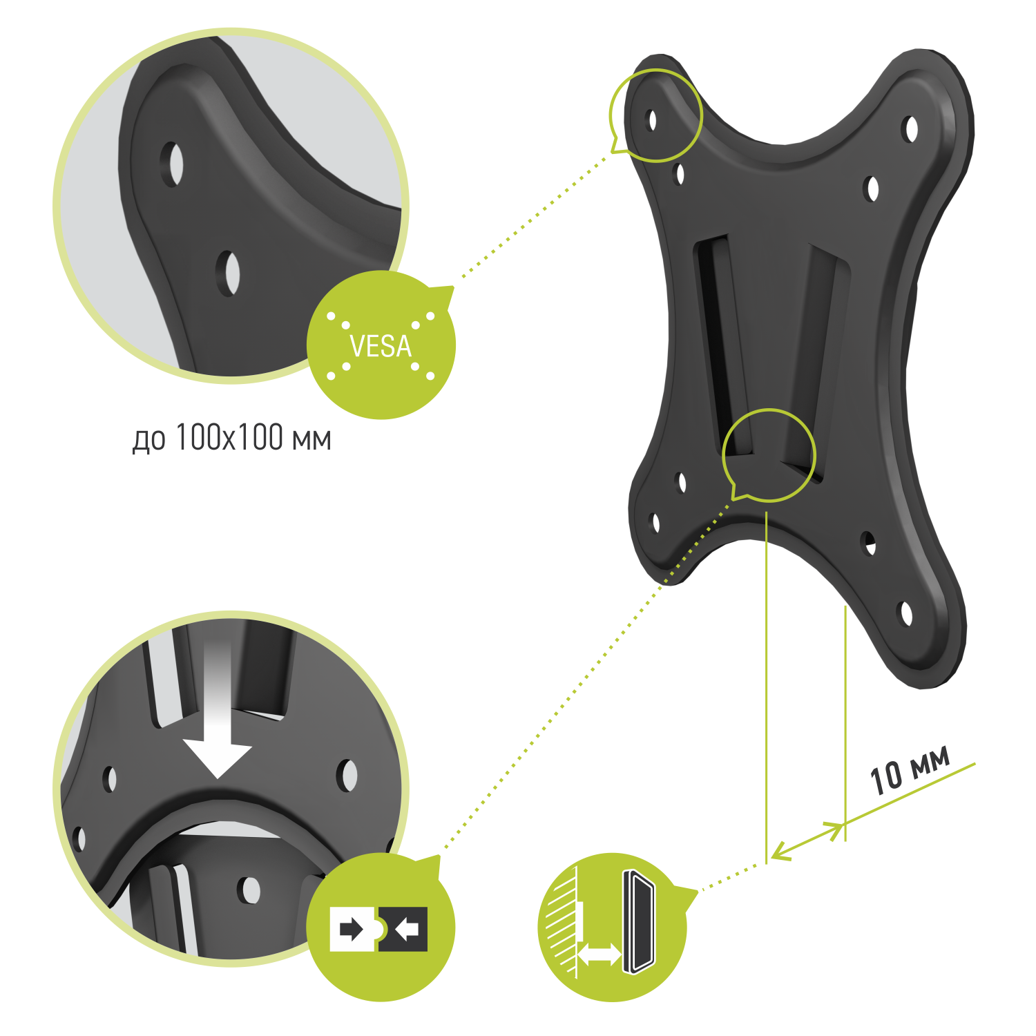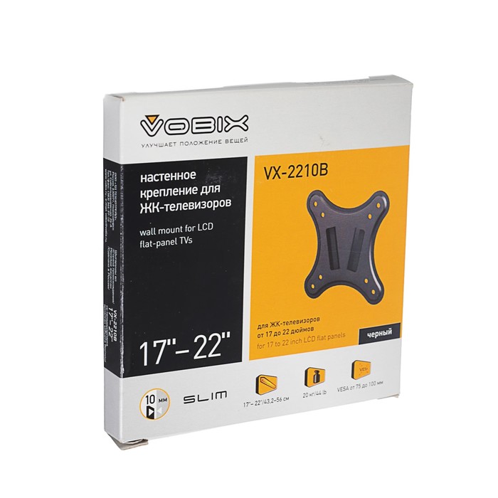 Кронштейн для ЖК-телевизора Vobix VX 2210 обеспечивает фиксированное крепление телевизора на расстоянии 10-22 мм от стены. Подходит для большинства ЖК телевизоров от 17 до 22 дюймов (43 - 56 см) со схемой крепежных отверстий VESA 100х100. В комплект поставки входят детали, необходимые для крепления к стене и монтажа ЖК-телевизора. Максимальная нагрузка до 20 кг.