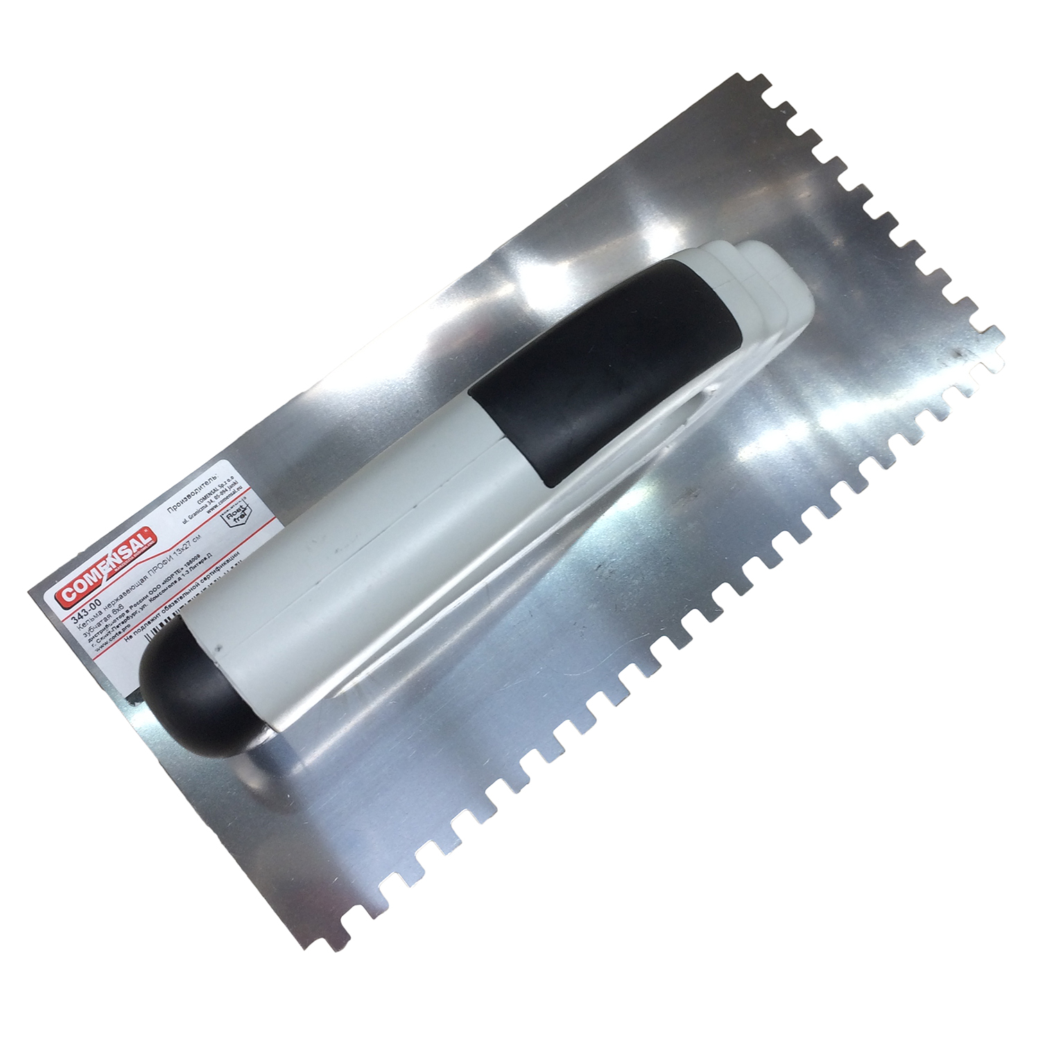 Гребенка из нержавеющей стали с эргономичной ручкой позволяет равномерно наносить клеевой раствор на обрабатываемую поверхность. Полотно обладает зубьями 6х6 мм, выполнено из нержавеющей стали и имеет зеркально гладкое исполнение. Для комфортного удержания инструмент оснащен двухкомпонентной рукояткой. Рукоять имеет высокую прочность, а сталь устойчива к химически активным веществам.