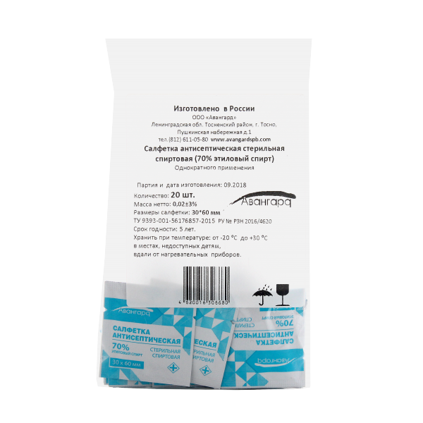 Салфетка изготовлена из материалов: нетканая основа - полотно нетканое гидросплетенное Спанлейс поверхностной плотности не менее 40 г./кВ.м; пропиточный раствор - раствор этилового спирта для наружного применения и приготовления лекарственных форм 70%. Салфетка упакована герметично термическим методом в индивидуальную упаковку изготовленную из материала комбинированного на бумажной основе (бумага, алюминиевая фольга, полиэтилен). В салфетке содержится не менее 0,4 г раствора спирта. Вскрытие упаковки не требует ножниц.