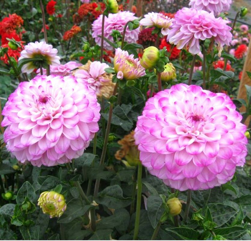 Шаровидные георгины – растения высотой 100-110 см, нуждаются в подвязке и опоре, цветут обильно и продолжительно. Цветы – необычные махровые шары, состоящие из плотных лепестков, свернутых в расширяющуюся кверху трубочку. Лепестки имеют тупые или скругленные кончики и слегка загнутую форму. Диаметр цветков 8-20 см. Это типично срезочные растения, дольше других стоят в вазе, идеально сохраняют форму и безупречный свежий вид.