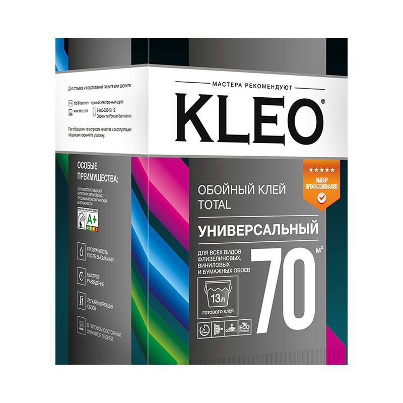Клей Kleo Total 70 предназначен для наклеивания всех видов флизелиновых, виниловых и бумажных обоев. Усиленная формула на основе метилцеллюлозы гарантирует быстрое и надежное приклеивание обоев любой плотности.