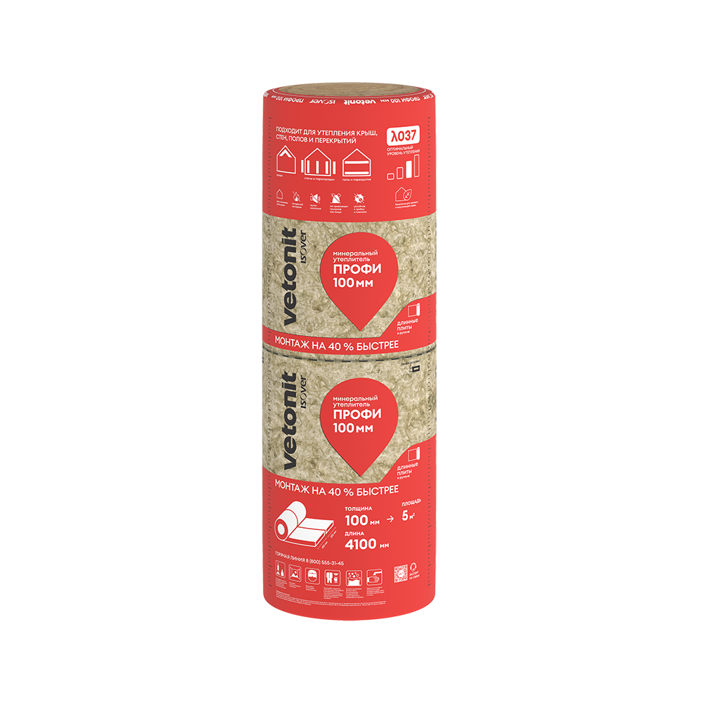 - с Изовер Профи монтаж быстрее на 40% по сравнению с утеплителями в плитах. В упаковке рулон уже нарезан на 2 рулона шириной 610 мм