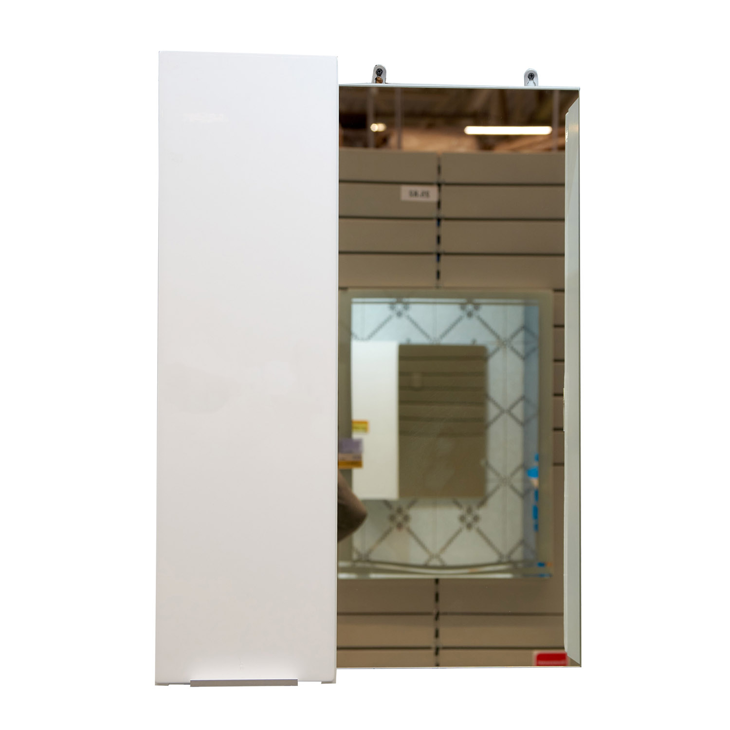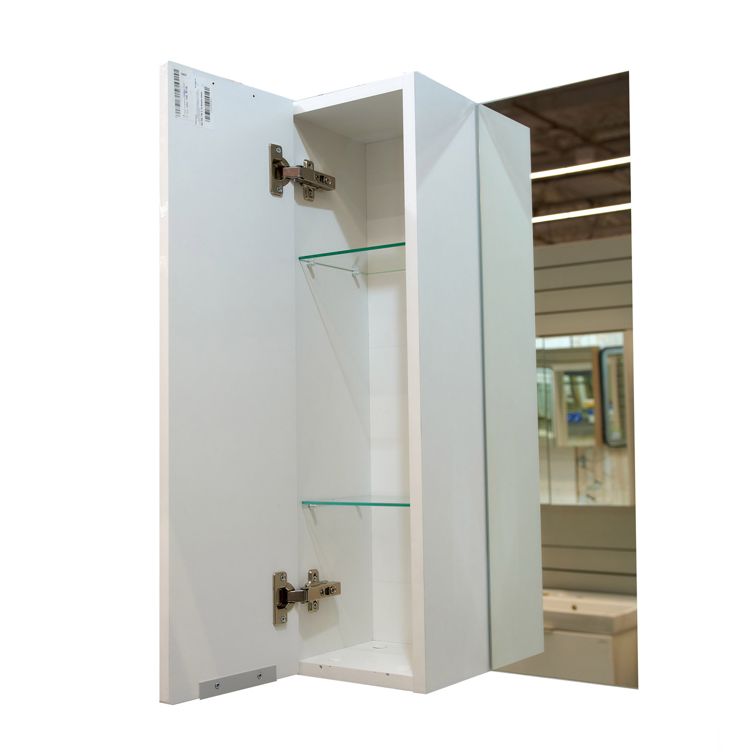 Недорогой шкаф с зеркалом Falesia 50 для ванной комнаты, выполненный в белом цвете, оснащен шкафчиком с вкладными полками, закрывающимся распашной дверцей.