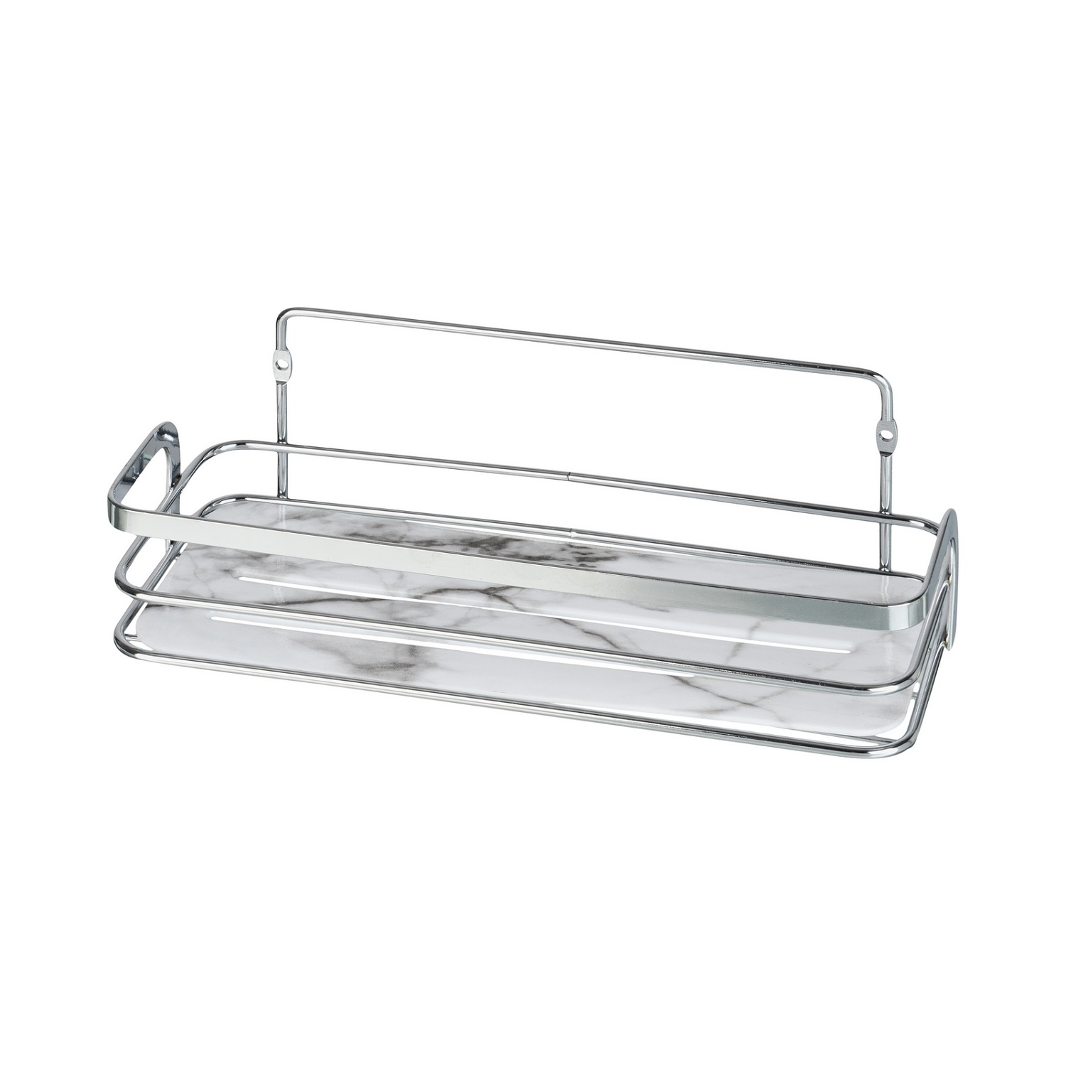 Полка для ванной комнаты необходимый аксессуар, когда все необходимое лежит в одном месте. Полка Marble изготовлена из хромированного железа и имеет пластиковую вставку имитирующую мрамор. Простой и удобный монтаж будет дополнительным подспорьем.