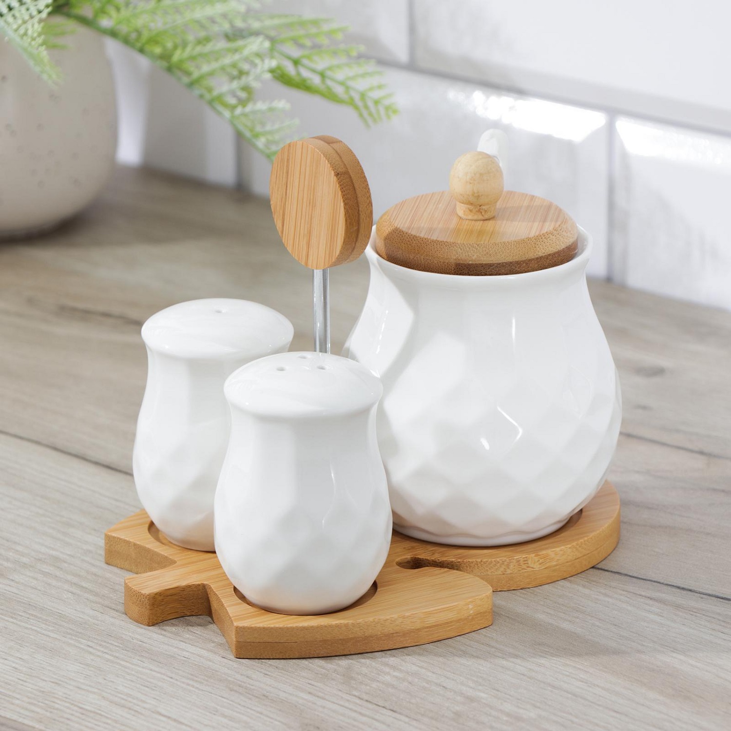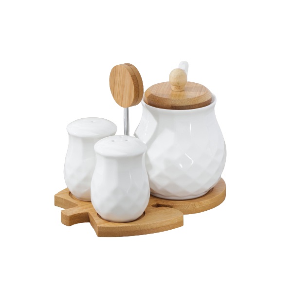 Набор для специй на дерев. подставке 3 пред. "Эстет" солонка, перечница, сахарница с ложкой 340858. Идеально подходит как для домашнего использования, так и для кафе или ресторана. Дизайн, эстетичность и функциональность набора позволят ему стать достойным дополнением к кухонному инвентарю.