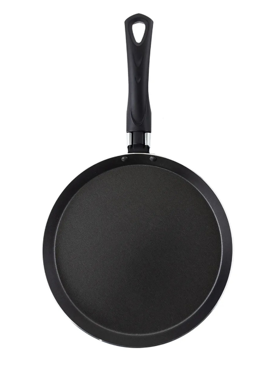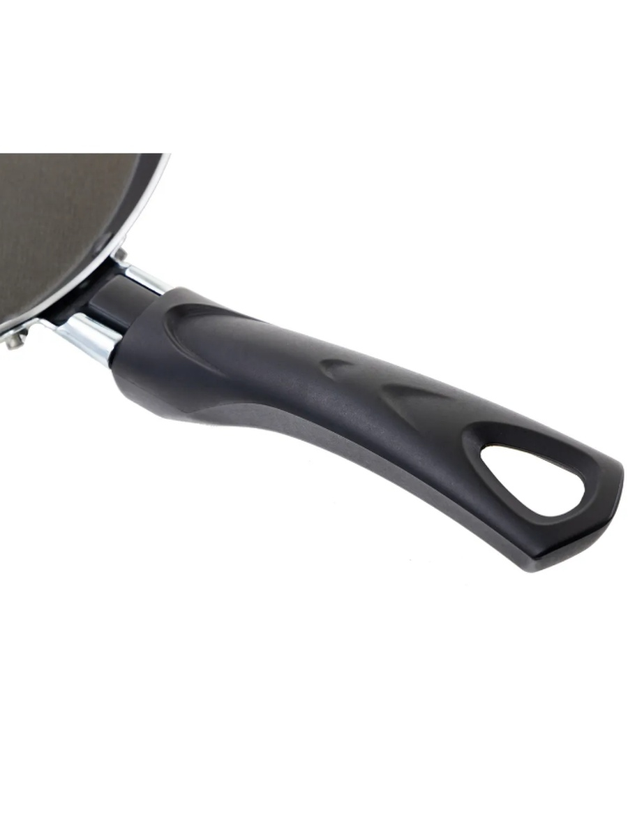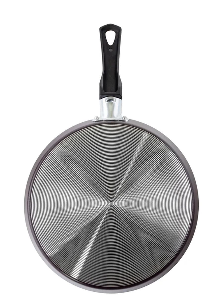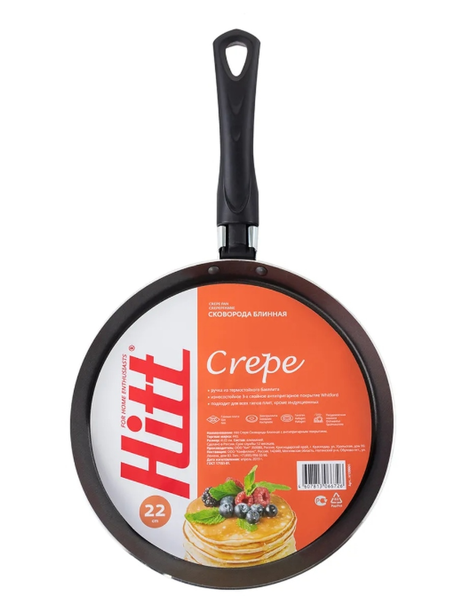 Сковорода Hitt Crepe, изготовленная из алюминия с антипригарным покрытием, предназначена специально для жарки блинов. Благодаря специальной форме и толстому дну сковорода устойчиво размещается на плите, равномерно нагревается и удерживает тепло. Блины быстро пропекаются и подрумяниваются. Низкий бортик дает возможность легко переворачивать и снимать готовые блины. Эргономичная пластиковая ручка не нагревается во время работы. Внешнее декоративное покрытие легко моется и долго сохраняет свой насыщенный цвет. Модель выпускается в бордовом цвете, подходит для газовых и электрических.