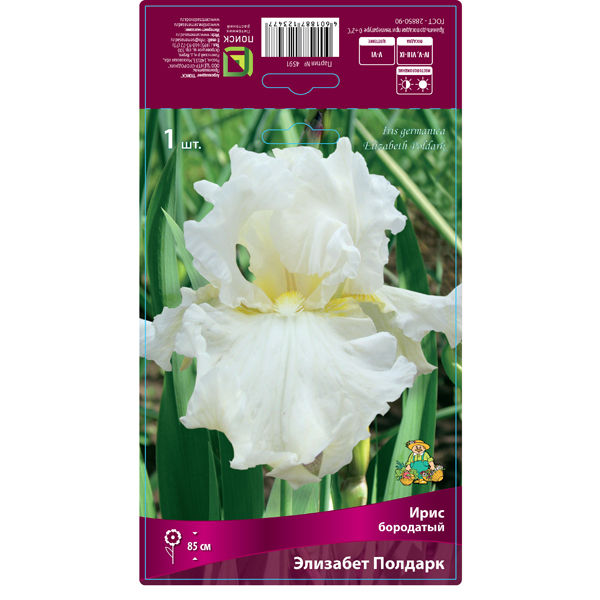 Элизабет Полдарк - высота растения 85 см. Цветки снежно-белые, с сильной гофрировкой лепестков и ярко-желтой, пушистой бородкой. "Месторасположение: освещенные, защищенные от ветра участки. Можно высаживать растения и в полутенистых местах, но cортовые ирисы светолюбивы.