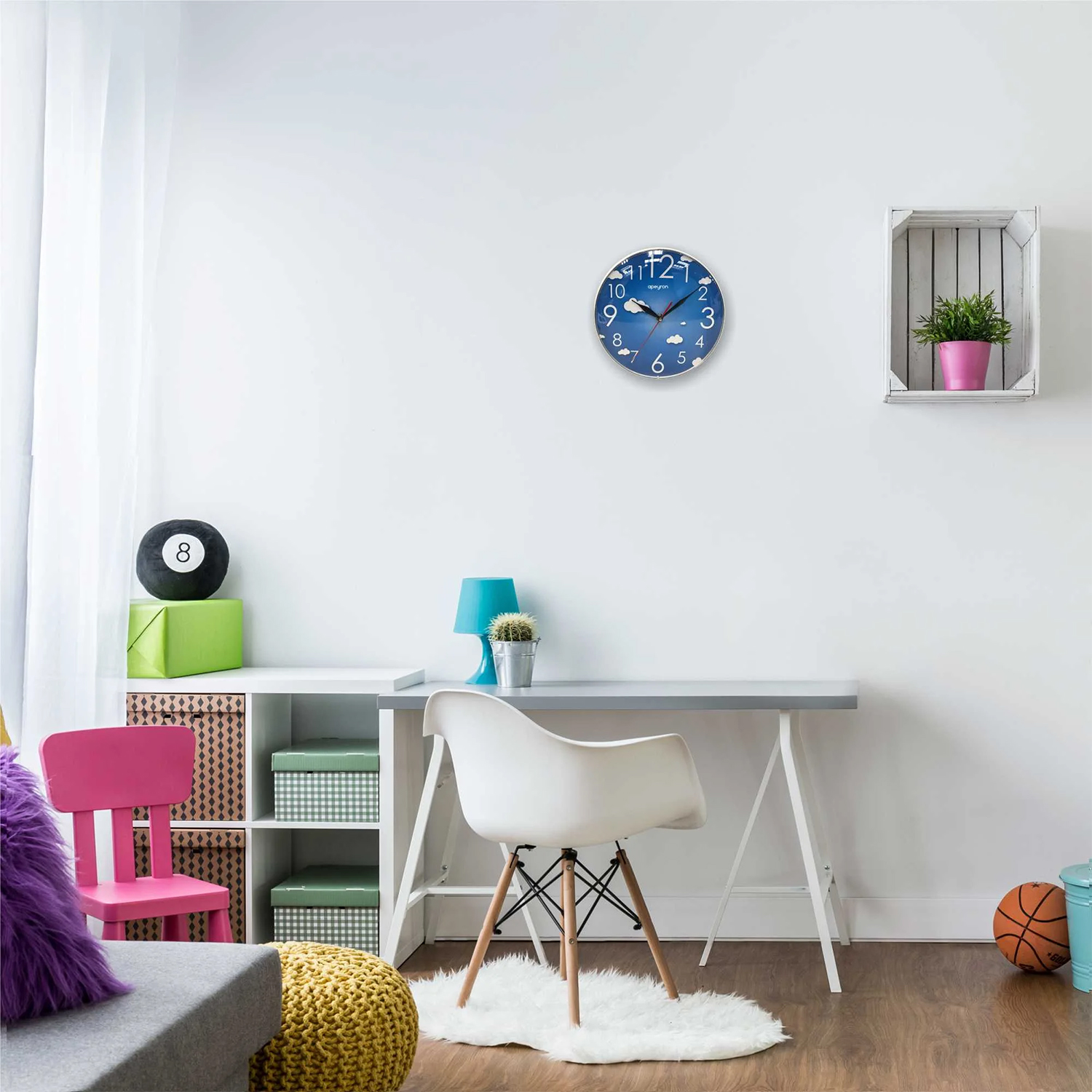 Настенные часы Apeyron представляют собой часы с корпусом из экологичного пластика. Лицевая сторона часов защищена пластиковым стеклом. На циферблате небесно-синего цвета с белыми облачками расположены арабские цифры и три стрелки. Часы сохранят тишину в помещении благодаря использованию бесшумного механизма плавного хода, который работает от батарейки стандарта АА (не входит в комплект).