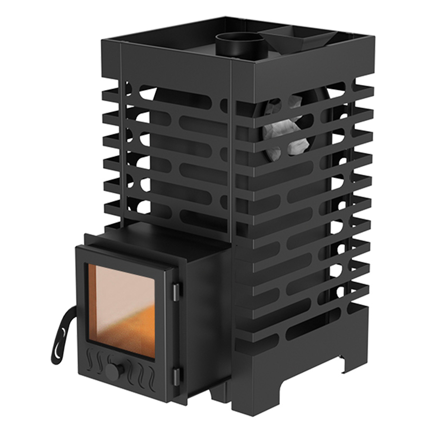 - глубокая невентилируемая каменка-труба из стали 09Г2С толщиной 4 мм прогревается открытым пламенем для максимального нагрева камней, заложенных в нее, и выполняет роль пламегасителя