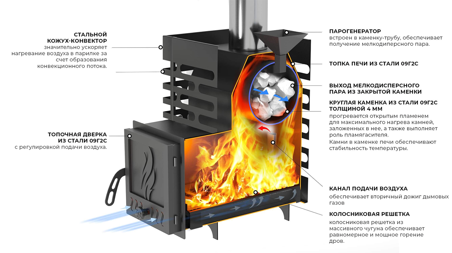 - универсальный парогенератор проходит через каменку-трубу, обеспечивая получение мелкодисперсного пара