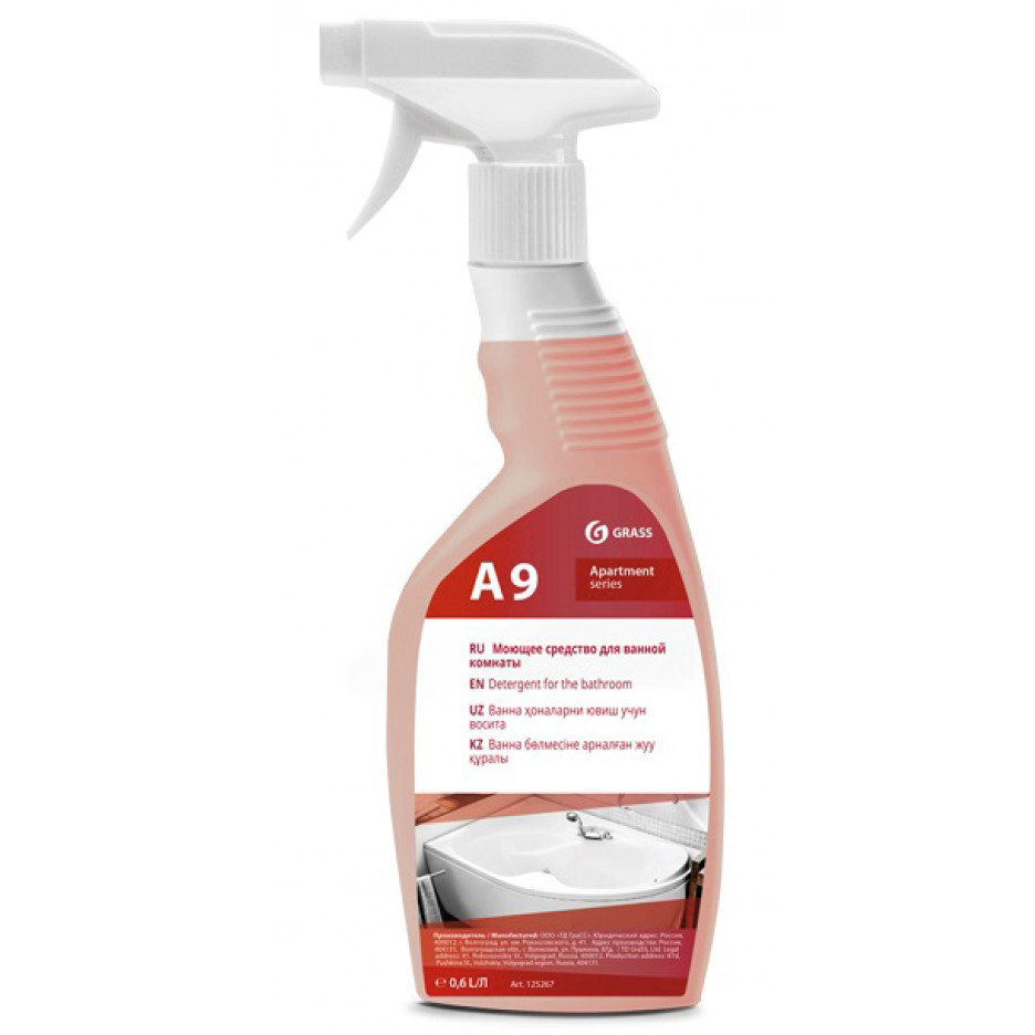 Кислотное моющее средство GRASS Apartment Series A9 для уборки ванных комнат подходит для бережной чистки душевых кабин, ванн, раковин, кранов и другого оборудования. Не повреждает хромированные, акриловые, пластиковые поверхности, кислотостойкую плитку и эмаль.