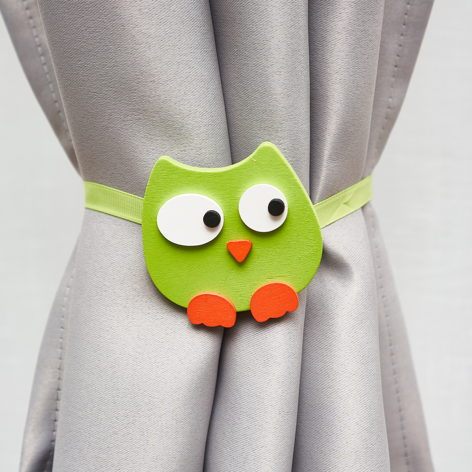 Подхват для штор Совушка выполнен из цветной ленты, с помощью которой штора захватывается и фиксируется соединением намагниченных декоративных элементов. В результате, драпировка ткани преобразовывается, а крой шторы визуально изменяется. Держатель подходит для гардин любой плотности, как для тяжёлых портьер, так и для лёгких тюлей. Яркая деталь с мультяшным изображением украсит не только шторы, но и будет радовать вашего малыша.