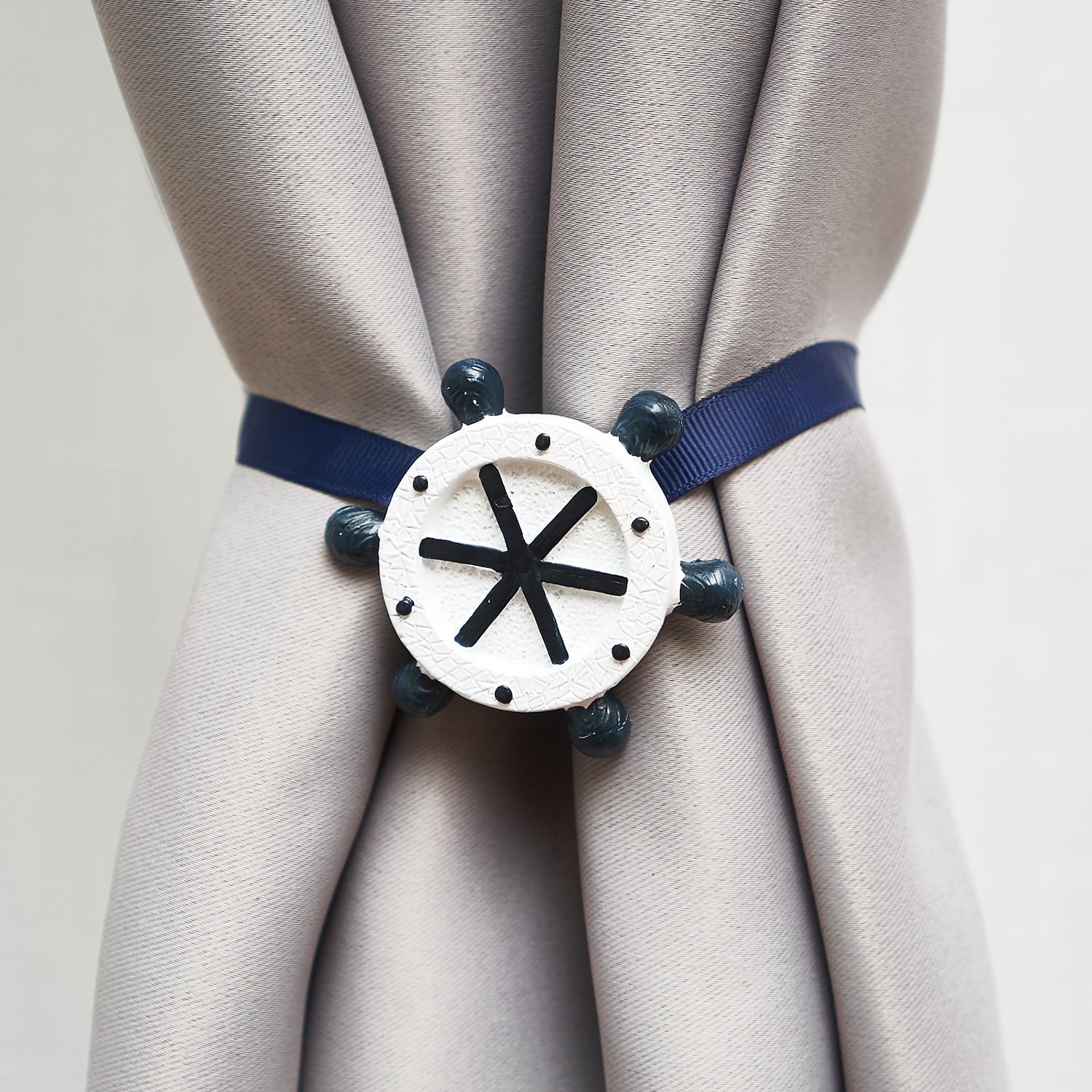 Подхват для штор Штурвал выполнен из цветной ленты, с помощью которой штора захватывается и фиксируется соединением намагниченных декоративных элементов. В результате, драпировка ткани преобразовывается, а крой шторы визуально изменяется. Держатель подходит для гардин любой плотности, как для тяжёлых портьер, так и для лёгких тюлей. Яркая деталь с мультяшным изображением украсит не только шторы, но и будет радовать вашего малыша.