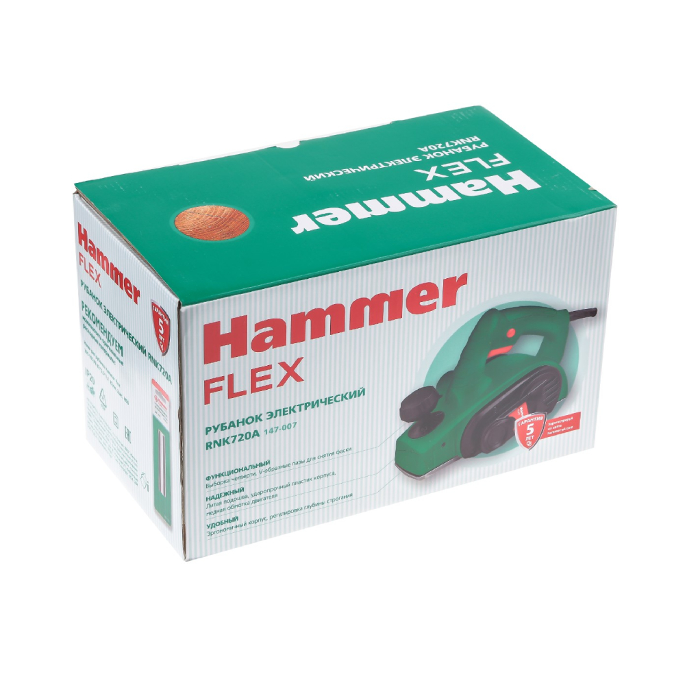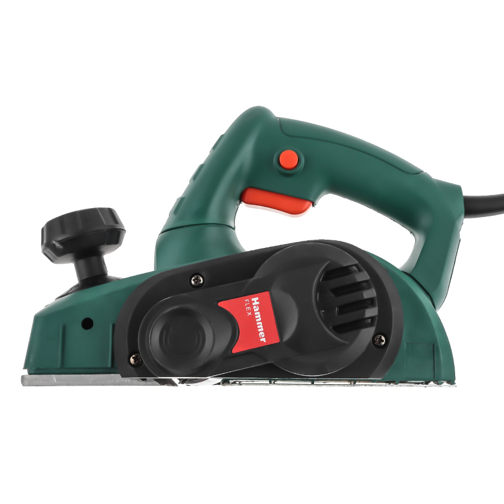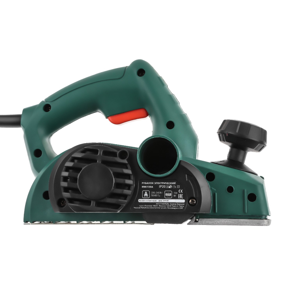 Электрорубанок Hammer RNK720A обрабатывает участки шириной 8.2 см при глубине строгания 2 мм. С его помощью удобно обрабатывать края деревянных заготовок и проводить фальцевание. Стружка отводится в правую сторону, но также конструкция прибора позволяет подключить строительный пылесос. Инструмент Hammer RNK720A действует со скоростью 16000 об/мин, гарантируя быстрое и аккуратное строгание. На подошве имеется одна V-образная канавка, облегчающая снятие фаски с обработанных заготовок. Прибор весит 2.5 кг, дополняется удобной ручкой с резиновой накладкой и длинным кабелем.
