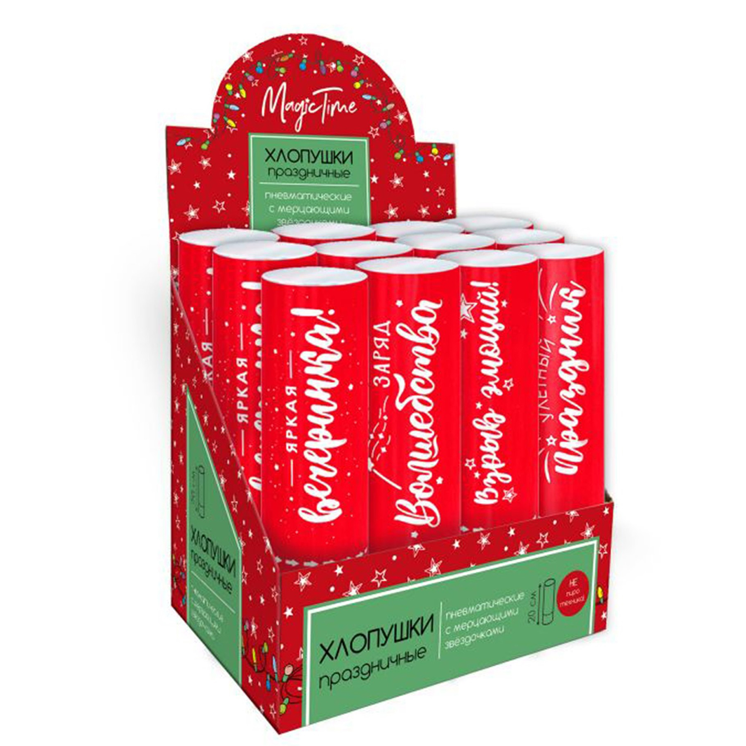 Праздничные хлопушки помогут сделать любой праздник веселее и ярче. Хлопушка действует на пневматическом механизме, который приводится в действие поворотом нижней части корпуса. Внутри хлопушка наполнена разноцветным голографическим конфетти. Корпус хлопушки выполнен из дизайнерского материала с голографическим эффектом, это дополнительно создает ощущение праздника.