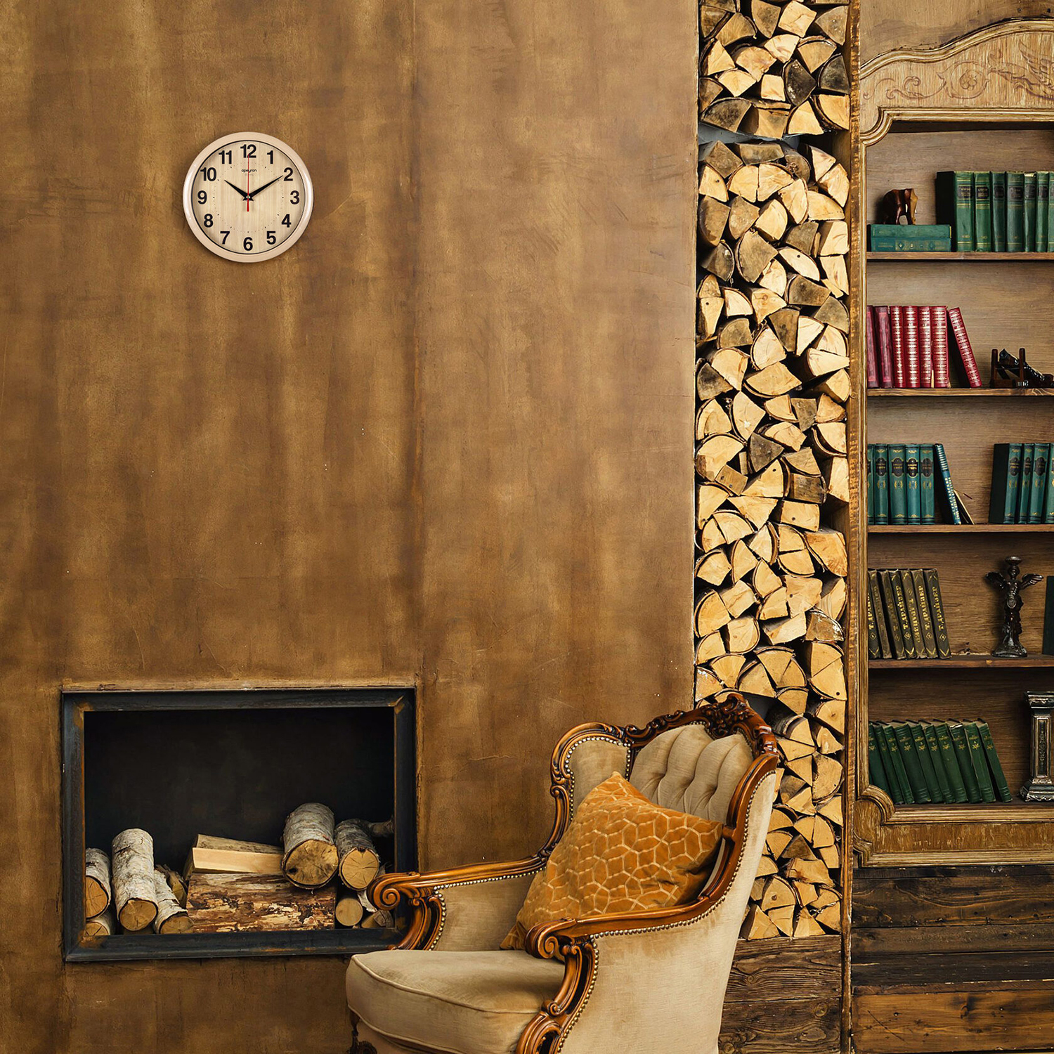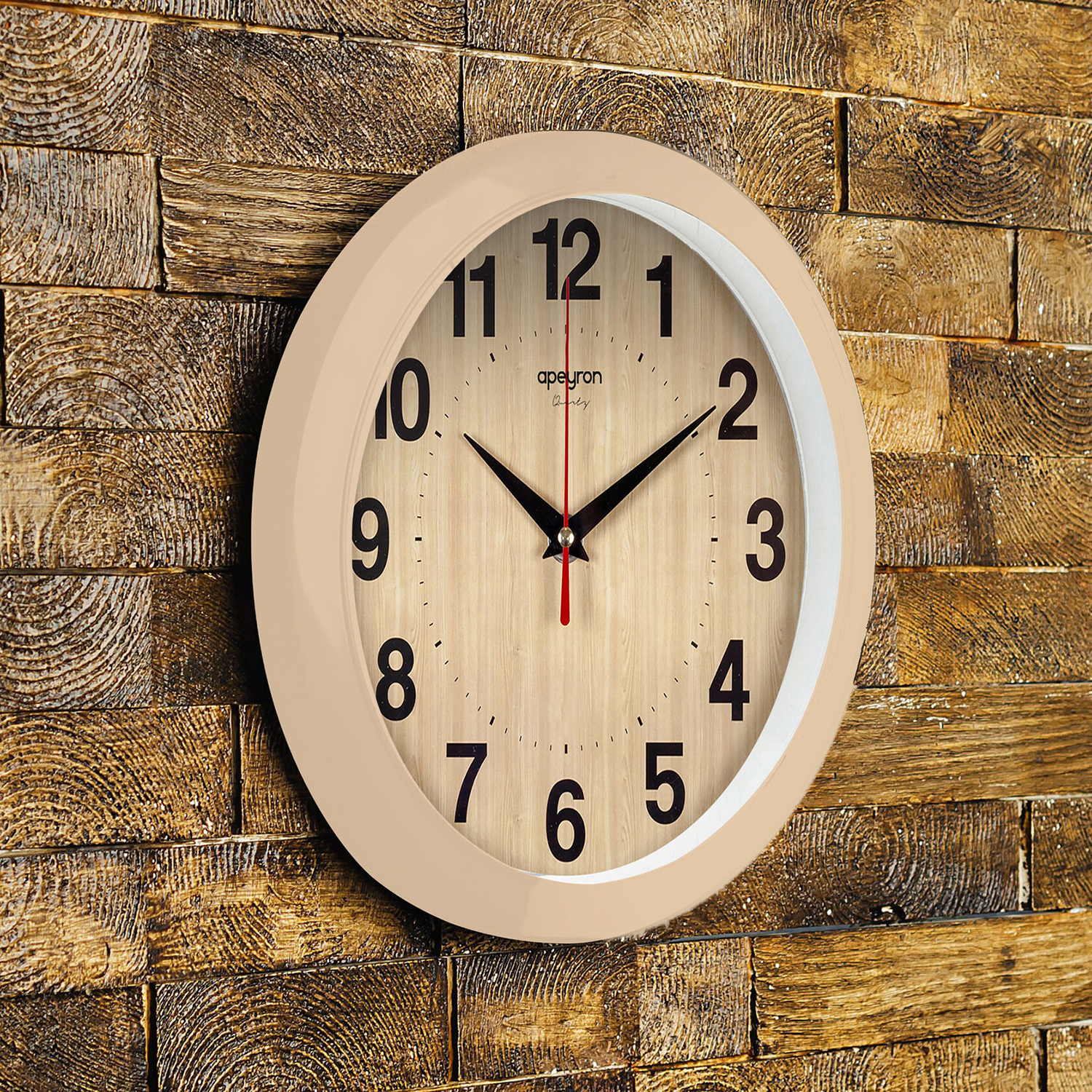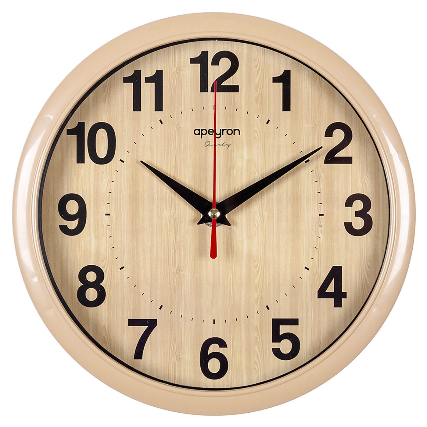 Настенные часы Apeyron представляют собой часы с корпусом из экологичного пластика. Лицевая сторона часов защищена минеральным стеклом. На циферблате часов, выполненном под дерево, расположены арабские цифры и три стрелки. Часы сохранят тишину в помещении благодаря использованию бесшумного механизма плавного хода, который работает от батарейки стандарта АА (не входит в комплект).