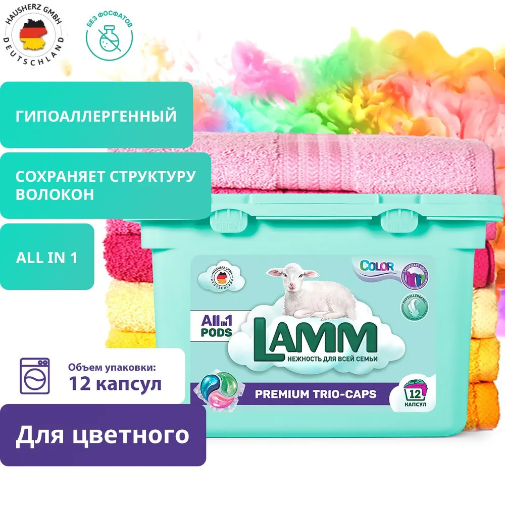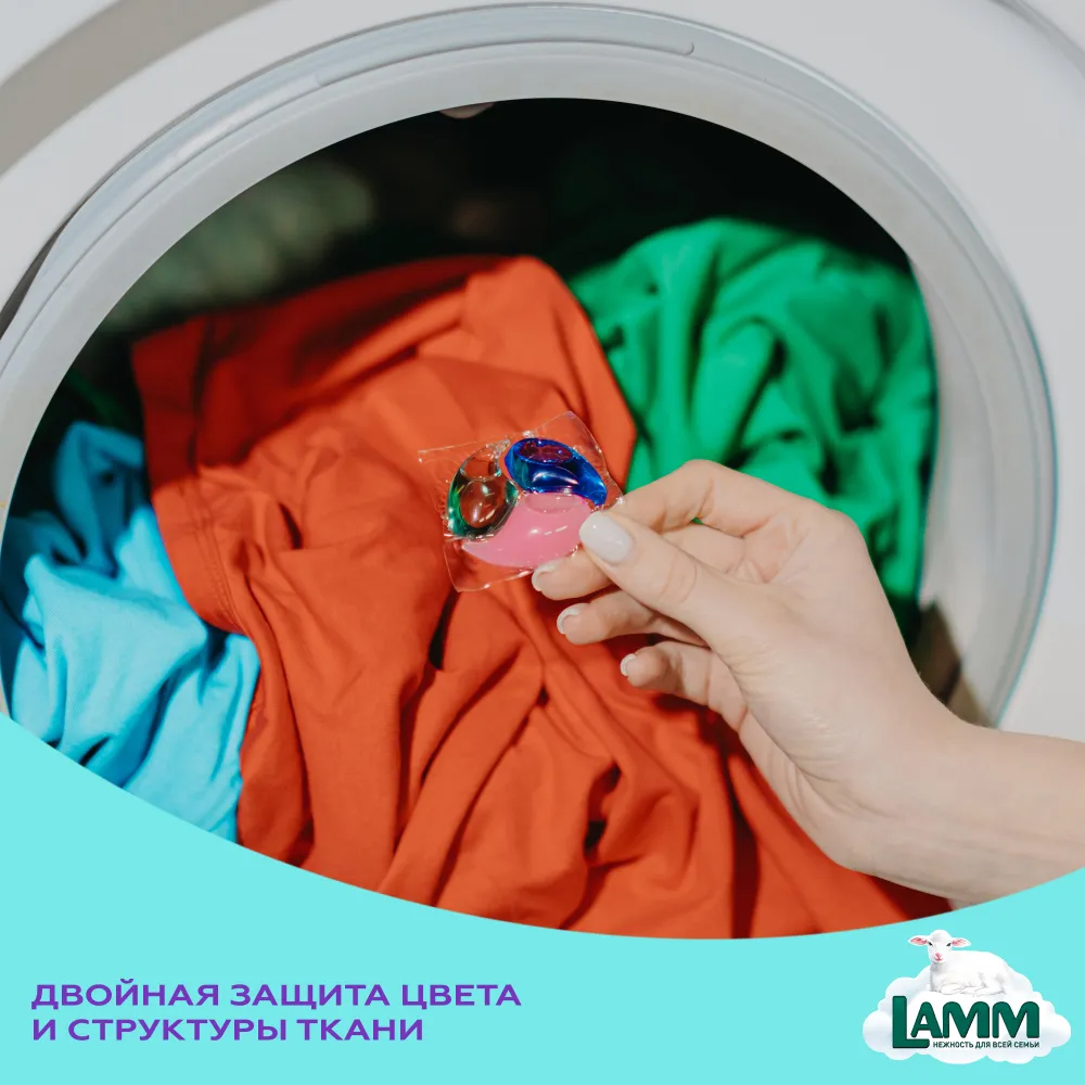 Гипоаллергенные капсулы для стирки LAMM Color All in 1 с пониженным пенообразованием с биодобавками эффективно и бережно отстирывают белые и цветные изделия из хлопчатобумажных, льняных и синтетических тканей, а также тканей из смешанных волокон в стиральных машинах любого типа. Особая 7-ми компонентная формула эффективно удаляет широкий спектр многослойных пятен, включая масляные, жирные, липкие, белковые и крахмальные пятна. Средство ухаживает за тканями, благодаря чему одежда и белье становятся не только чистыми, но и приятными на ощупь.