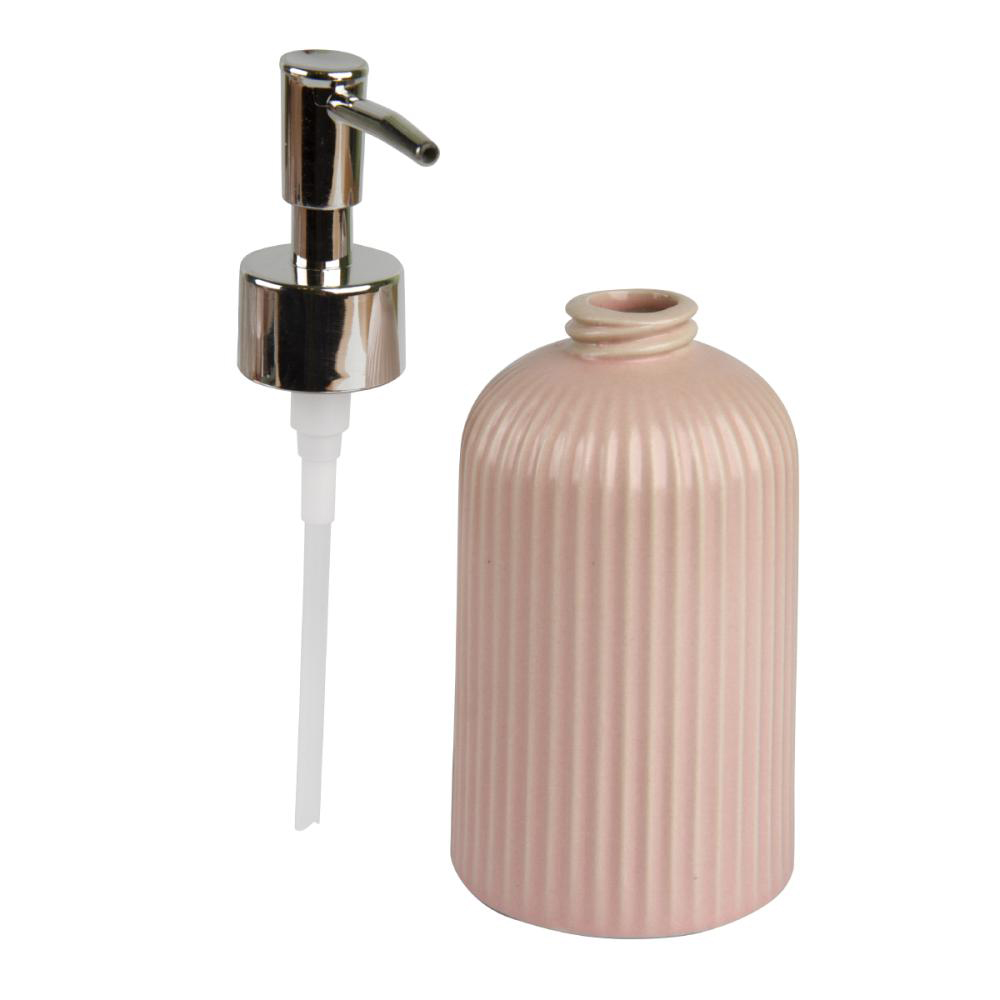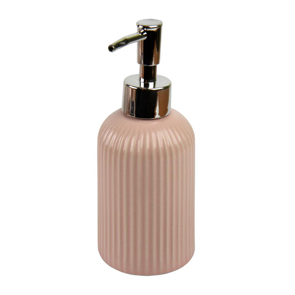 Дозатор для жидкого мыла Плиссе розовый цилиндрической формы с ребристой поверхностью, предназначен для порционной подачи мыла, шампуней и других гелеобразных жидкостей. Подача моющего средства осуществляется с помощью пластиковой хромированной помпы. Влагоустойчив.
