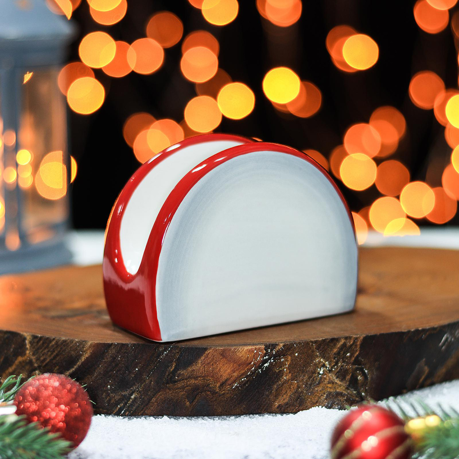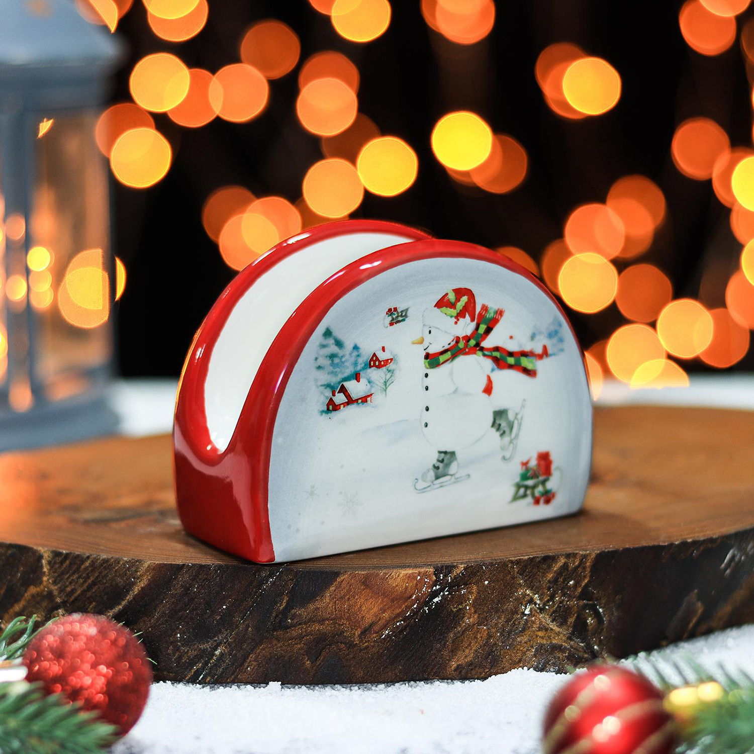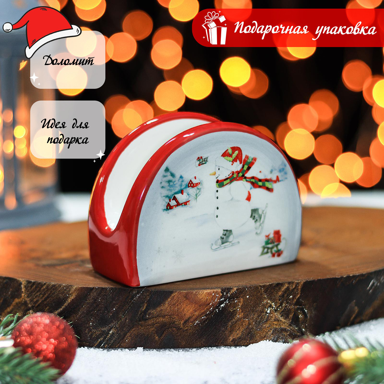 Подставка для салфеток изготовлена из доломита. Новогодний дизайн, мягкая обтекаемая форма, идеально ровная текстура – то, что необходимо для сервировки новогоднего стола. Изделие очень красиво выглядит с салфетками контрастного цвета. Подставка отличается ударопрочностью, стойкостью к образованию сколов, легко отмывается губкой или в посудомоечной машине. Благодаря массивной нижней части, салфетница максимально устойчива и удобна в ежедневном использовании.
