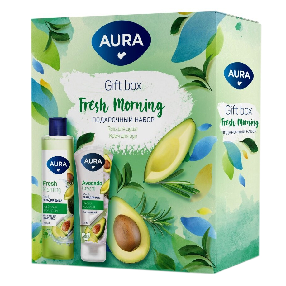 Подарочный набор женский Aura Fresh Morning для ухода за телом включает в себя гель для душа с экстрактами авокадо и розмарина и крем для рук.