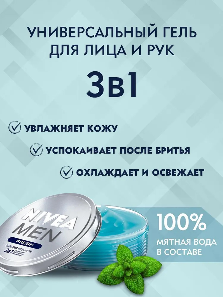 Гель 3в1 Fresh для лица и рук Nivea Men обеспечивает мгновенную свежесть и 24-часовое увлажнение для лица, тела и рук. Гель сверхлегкий и легко наносится. Формула на основе 100% натуральной водяной мяты не оставляет ощущения липкости и не жирности.