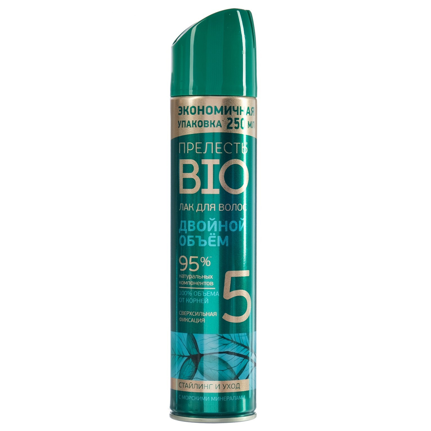 Лак для волос Прелесть BIO Двойной объем великолепно фиксирует укладку и надежно сохраняет ее в течение всего дня. Лак содержит 95% натуральных компонентов в составе. Морские минералы способствуют восстановлению структуры волос, утолщают его, благодаря чему достигается дополнительный объем.