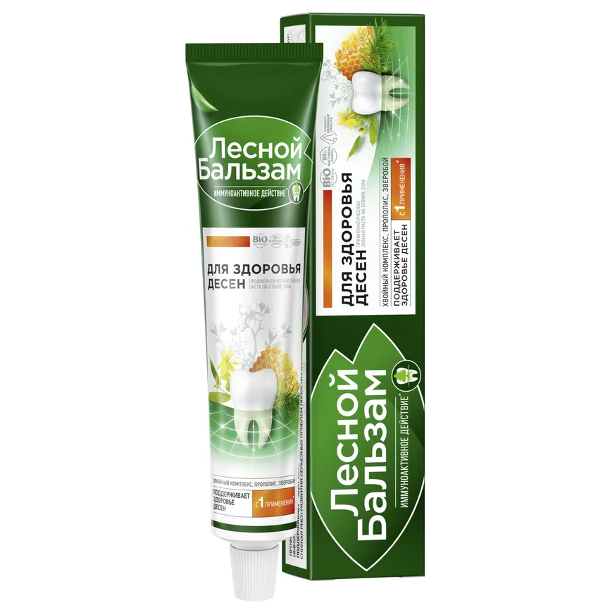 Профилактическая зубная паста Лесной бальзам на отваре трав с прополисом способствует интенсивному питанию и укреплению десен. Она обладает иммуноактивным действием и в 2 раза улучшает работу собственного иммунитета полости рта, снижая риск развития проблем с деснами.