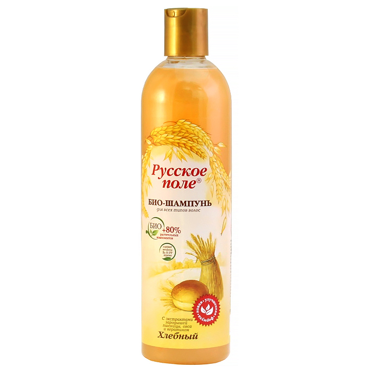 Био-шампунь Русское поле для всех типов волос содержит экстракт зародышей пшеницы, овса и кератином. Обновленная эффективная формула шампуня, с экстрактом зародышей пшеницы, комплексом витаминов и кератином деликатно очищает волосы любого типа, помогает нормализовать жировой баланс кожи головы, возвращает волосам природный блеск и силу.
