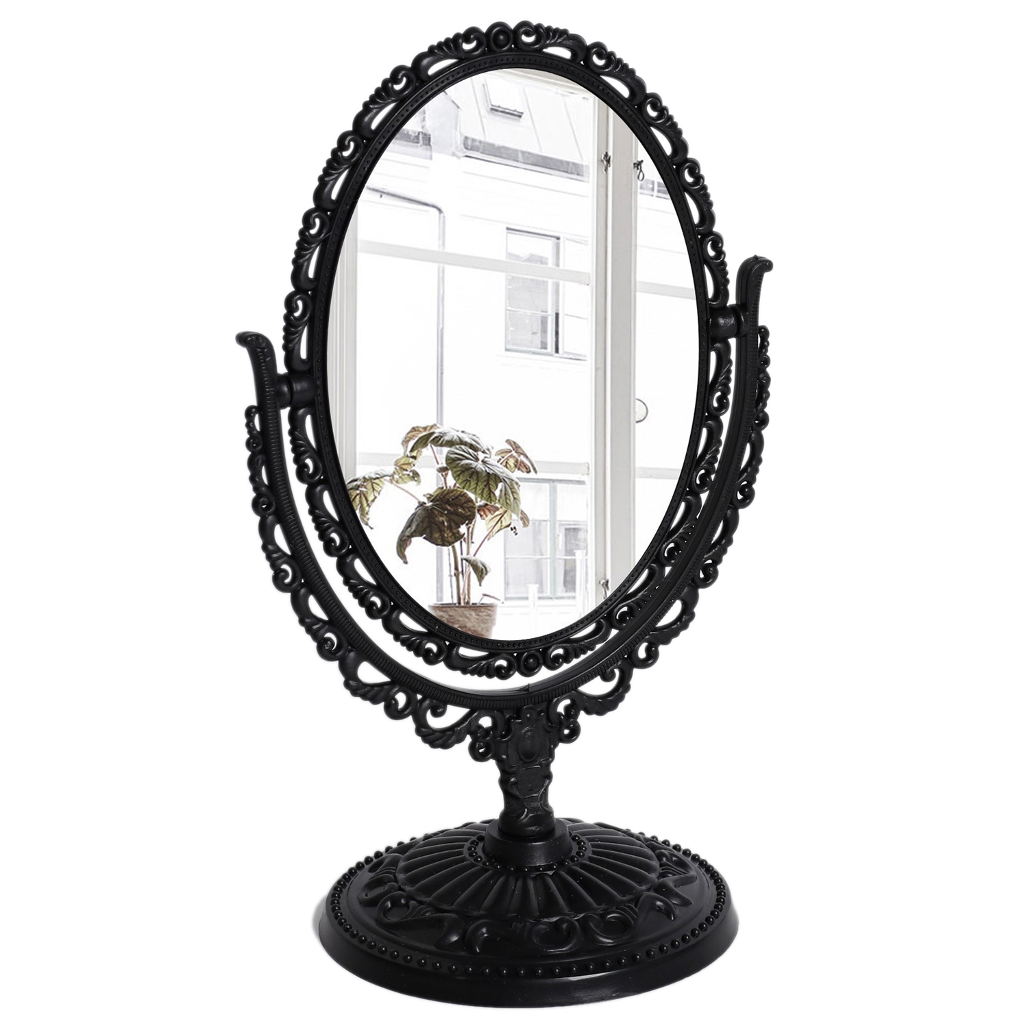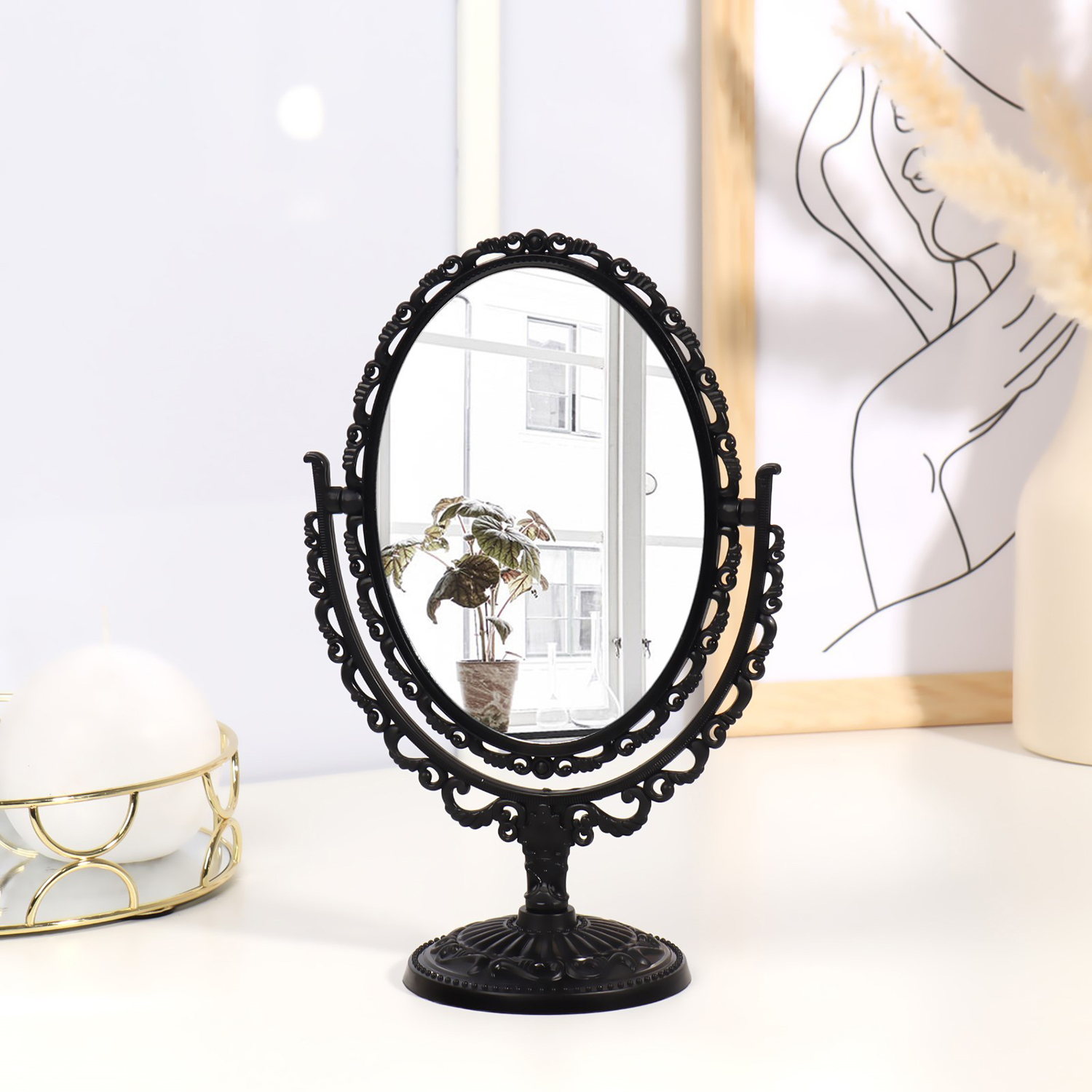 Изящное зеркало на ножке — украшение для туалетного столика. Конструкция не расшатывается и устойчиво держится на поверхности. Увеличивающая линза пригодится, чтобы рассмотреть детали макияжа.