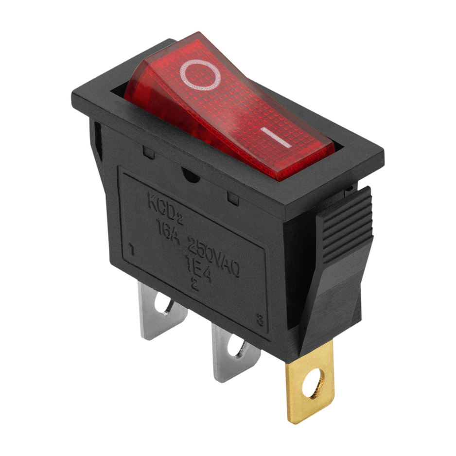Выключатель клавишный ON-OFF красный с подсветкой предназначен для коммутации электрических цепей переменного тока напряжением до 250В. Клавишные выключатели применяются в качестве комплектующих изделий различного электрооборудования (в сетевых фильтрах и удлинителях, аудио-оборудовании, блоках питания, электроустановках на различных производствах, автомобилях, и многих других местах). Такой клавишный переключатель имеет два положения. Принцип действия основан на перемещении клавиши в одну из позиций. Для переключения в нужное положение требуется приложить некоторые усилия на клавишу, до 250В.