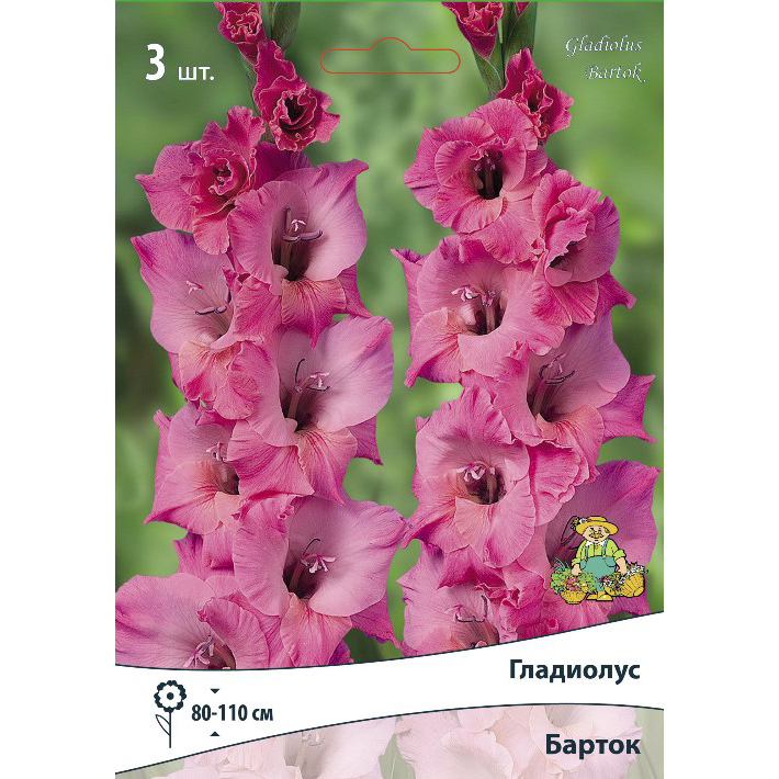 Гладиолус – клубнелуковичное растение высотой 50-150 см с вертикальным стеблем и линейными или мечевидными листьями. Цветки воронковидные, собраны в колосовидное соцветие до 80 см длиной, самых разнообразных окрасок, могут быть простыми или гофрированными. Барток - высота растения 80-110 см. Цветок розово-лиловый с более темными пурпурными кончикамий.