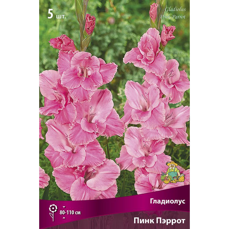 Гладиолус – клубнелуковичное растение высотой 50-150 см с вертикальным стеблем и линейными или мечевидными листьями. Цветки воронковидные, собраны в колосовидное соцветие до 80 см длиной, самых разнообразных окрасок, могут быть простыми или гофрированными.Пинк Пэррот - высота растения 80-110 см. Розовый оттенок плавно меняется от светлого до малиново-розового.