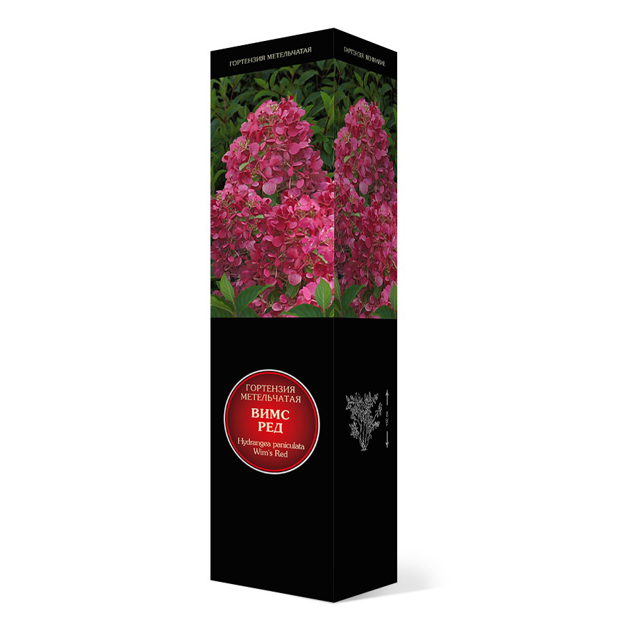 Вимс Ред - кустарник высотой до 1,5 м. Побеги бордово-красного цвета. Соцветия конические. Цветки белые, во время цветения меняют белый цвет на розовый, а затем на красный.