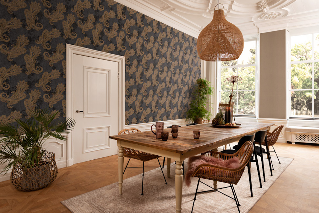 Индия — страна ярких сари и фестиваля красок Холи, поэтому при работе над коллекцией Indian Style , бренд Rasch выбрал самые сочные оттенки из палитры. Благодаря жизнерадостной фуксии, бирюзовому и лимонному, сюжет с королевским садом и утонченный орнамент выглядят современно, и не требуют поддержания этнической нотки в интерьере. Разумеется, любители сдержанных расцветок найдут здесь достаточно серо-бежевых вариантов. А если Вы равнодушны к теме Индии, можно выбрать геометрической принт или отличные однотонные обои.