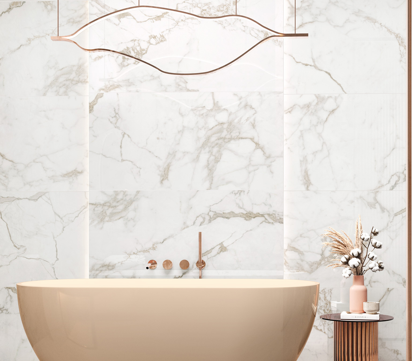 Текстура керамогранита Calacatta Arabesque 600х1200 мм в виде редких витиеватых теплые жил, плавно переплетающихся на поверхности камня, они тонко акцентируют его природную красоту и уникальность текстуры. Такой керамогранит сочетается с деревянными текстурами и металлическими аксессуарами, а также станет гармоничным компаньоном к акцентным темным мраморам. Коллекция представлена с полированной поверхностью и ректифицированными краями, это позволит зрительно расширить пространство и осуществить укладку материала с минимальным швом.